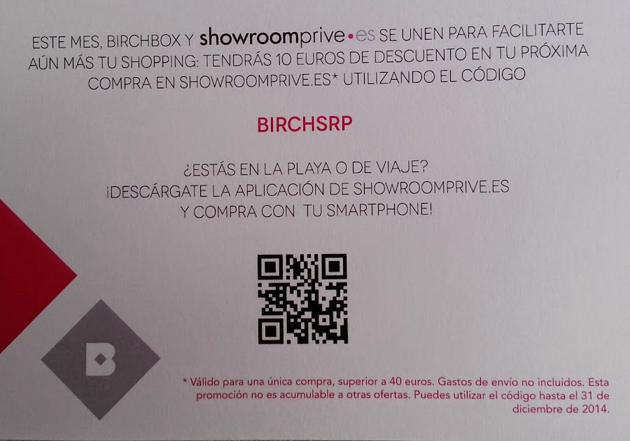 Como extra, este mes colaboran con Showroomprive.es y nos incluyen un descuento de 10â?¬ para compra en dicha web. El código se puede utilizar hasta el 31 de diciembre de 2014 pero solo para compras superiores a 40â?¬. Yo no creo que lo vaya a usar, pero os lo dejo por si vosotr@s podéis/os apetece aprovecharlo.