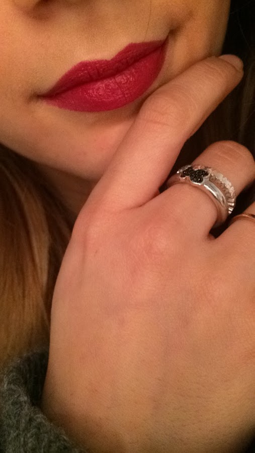 Por el resto, es genial. El color es muy bonito, muy de mi estilo. Me gustan los labiales tirando a oscuros, y éste es un tono entre rojo y morado, y como dice, un pequeño toque fucsia. El tono cambia un poco dependiendo de las capas que apliques, siendo un poco más claro con una sola, y más oscuro con dos o tres. En las fotos, apliqué tres capas. Es de fácil aplicación gracias a su cremosidad y la forma puntiaguda que tiene. No reseca los labios.