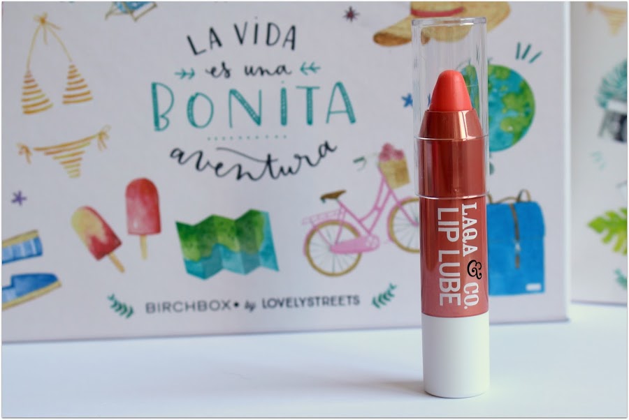 El primero de los productos de maquillaje que tare la caja es un labial muy veraniego de la marca Laqa & co, que personalmente no conocía. Estos labiales aportan un pigmento brillante y duradero que, combinado con una fórmula a base de manteca de karité, vitamina E y menta. Ya he probado el tono que me ha tocado, que es un coral muy fresco, y queda muy bonito.