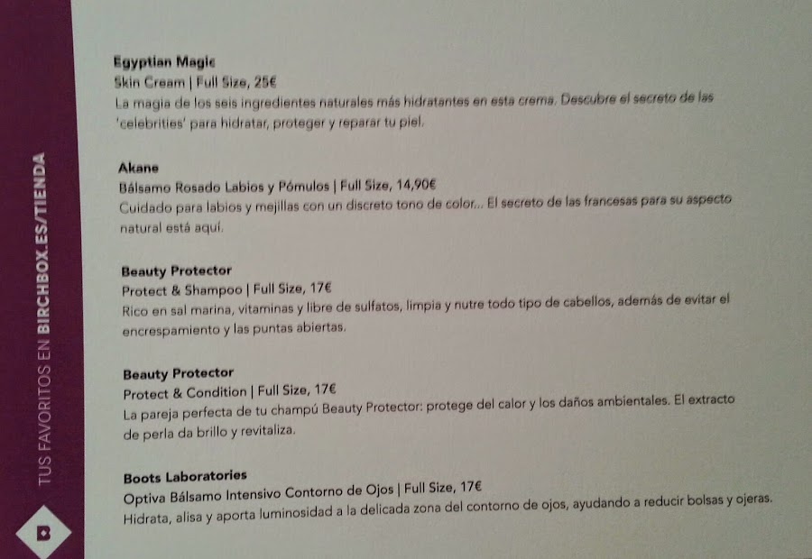 Respecto a la caja tengo que decir que me ha gustado, no me parece extraordinaria pero no está mal. La selección de productos, en mi opinión vuelve a ser acertada. Estoy encantada de poder probar la mítica Egyptian Magic y la marca Beauty Protector me tiene enamorada. Estoy deseando probar el contorno de ojos, estoy segura de que me vendrá estupendamente para mis siempre presentes ojeras. Y el bálsamo con color me parece estupendo para cuidar nuestros labios y realzarlos al mismo tiempo.
