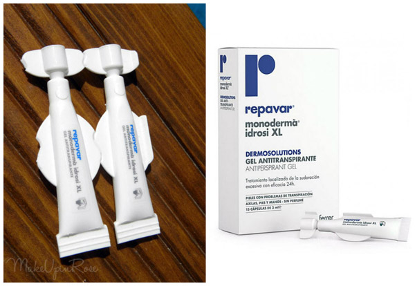 Este es un producto que casi nadie ha sabido para que sirve, y no es más que un tratamiento localizado de la sudoración excesiva de axilas, pies, manos y cara, que además promete una eficacia de 24hrs. Lo hay en formato monodosis (como nos vino en la caja), y al parecer también en roll-on.