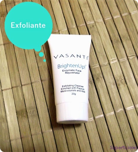Crema exfoliante rejuvenecedora de Vasanti: se debe utilizar una vez a la semana, es una crema limpiadora y exfoliante a la vez, lleva enzimas de papaya y microcristales, y nos promete ir reduciendo imperfecciones y líneas de expresión a medida que se va utilizando. La he probado y es una maravilla, después de lavar el rostro y secarlo, la piel queda suave y aterciopelada.