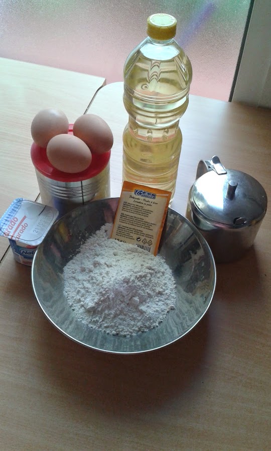 El primer paso es separar las claras de la yemas, en la receta en que me base no lo hacen , pero yo la prefiero para que salga más esponjoso. A continuación batir las yemas con el azúcar. Batir hasta que estén perfectamente mezclados, una masa homogénea. Añadir el yogur, la leche condensada y el aceite de girasol. Se vuelve a mezclar hasta que todo este unido. Una vez este todo unido, se le añade la harina tamizada junto con la levadura.