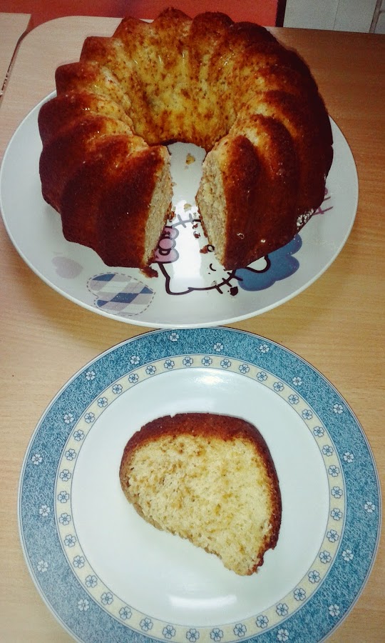 Introducir el bizcocho en el horno precalentado a 180 grados, con calor por arriba y por abajo. En mi caso necesito un poco más de cuarenta minutos para terminar de cocerse.