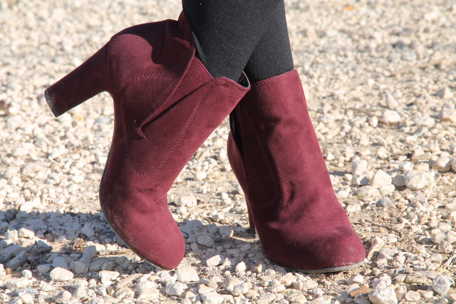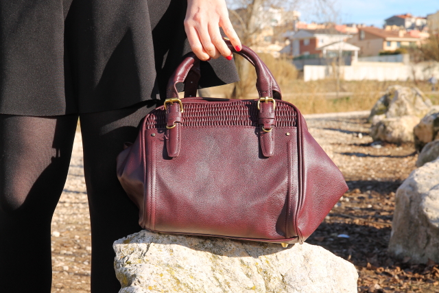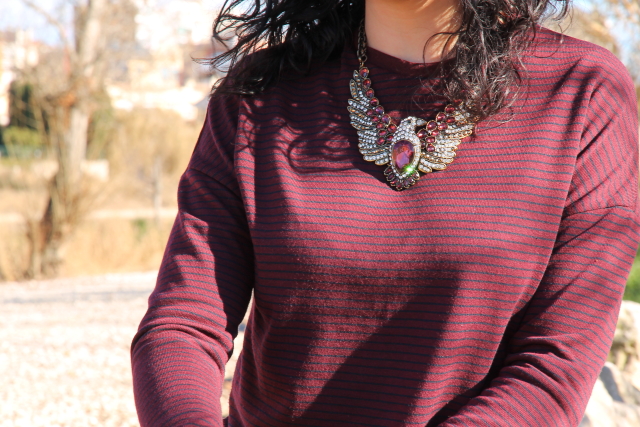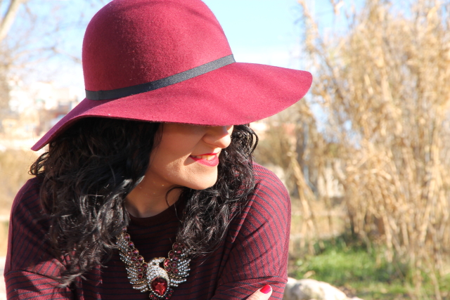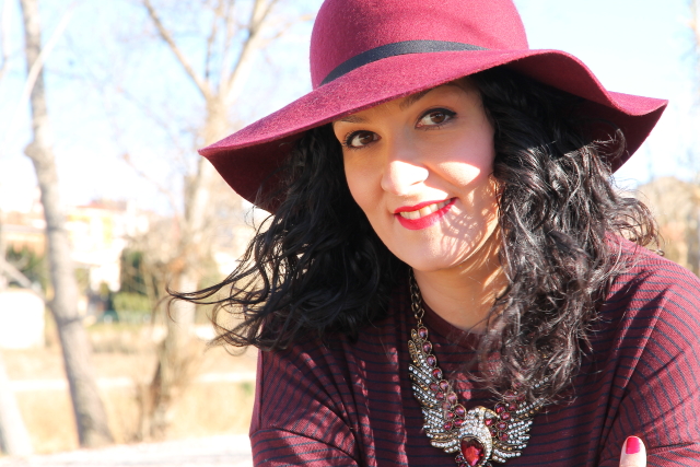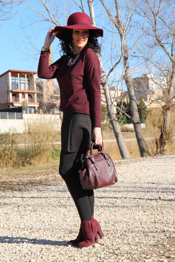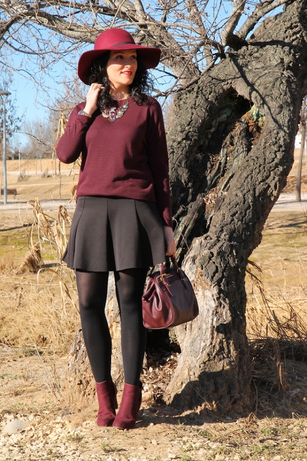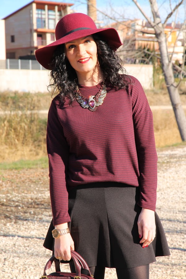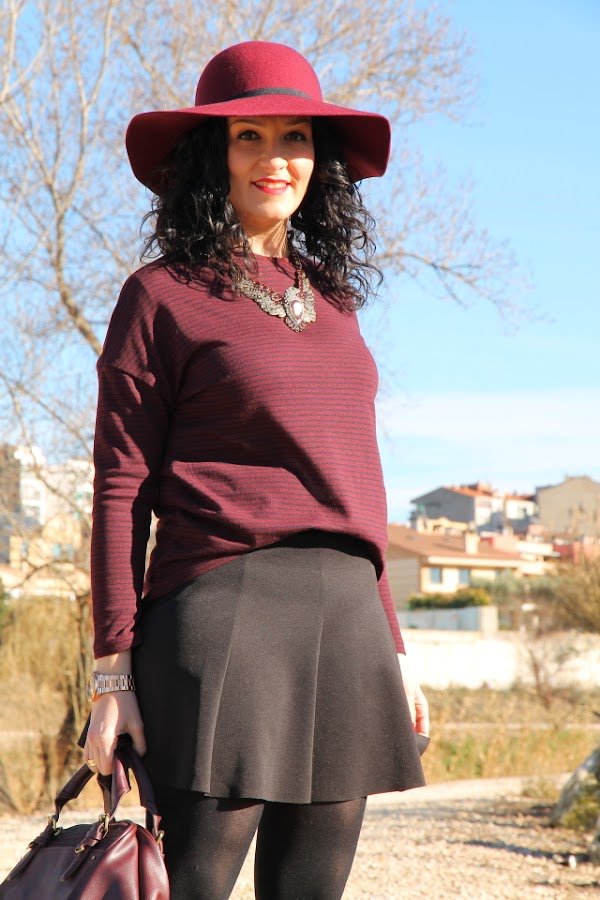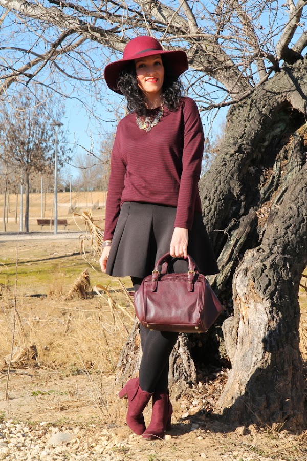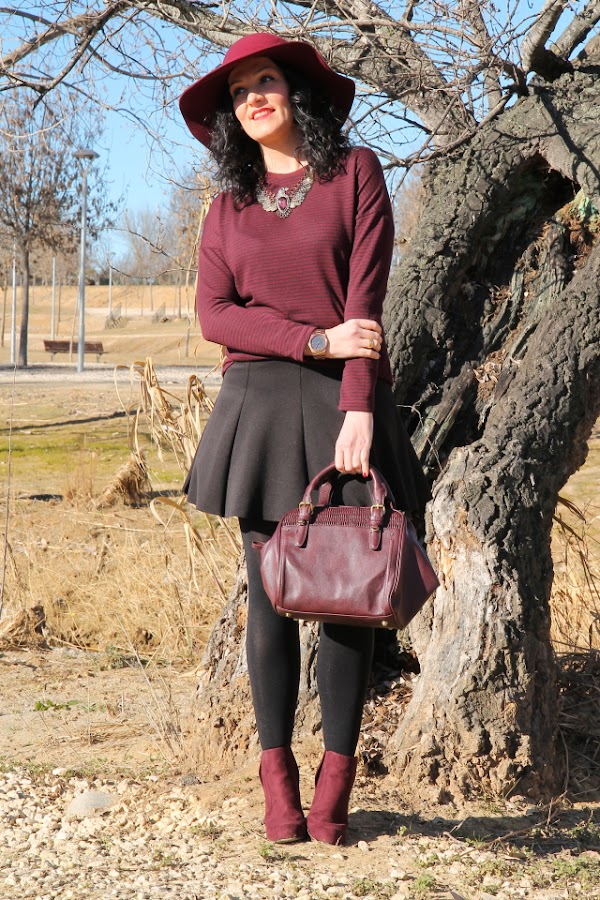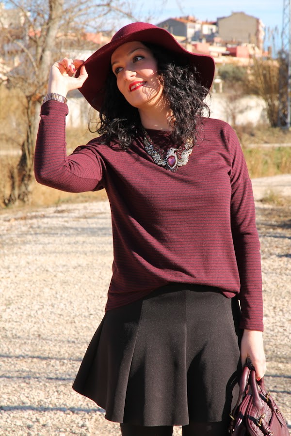 Aunque el sol y yo no somos muy buenos amigos... ¡tengo tantas ganas de primavera que en cuanto veo un rayo de sol voy detrás de él!. Este look es de hace unos domingos, salió un día precioso con un solazo increíble, así que decidí dejar de lado los jerséis y me puse una camiseta de rayas que combina burdeos con negro y falda negra. El resto del outfit lo completé con con fedora, bolso y botines también en granate.