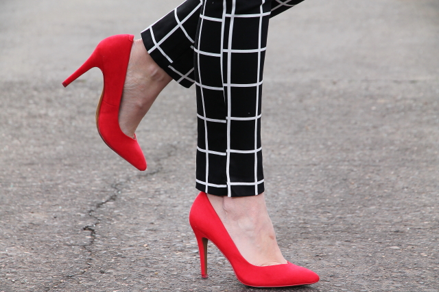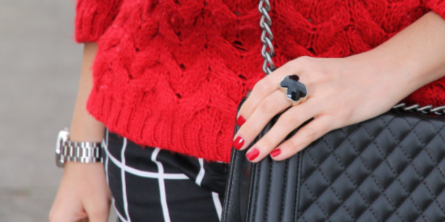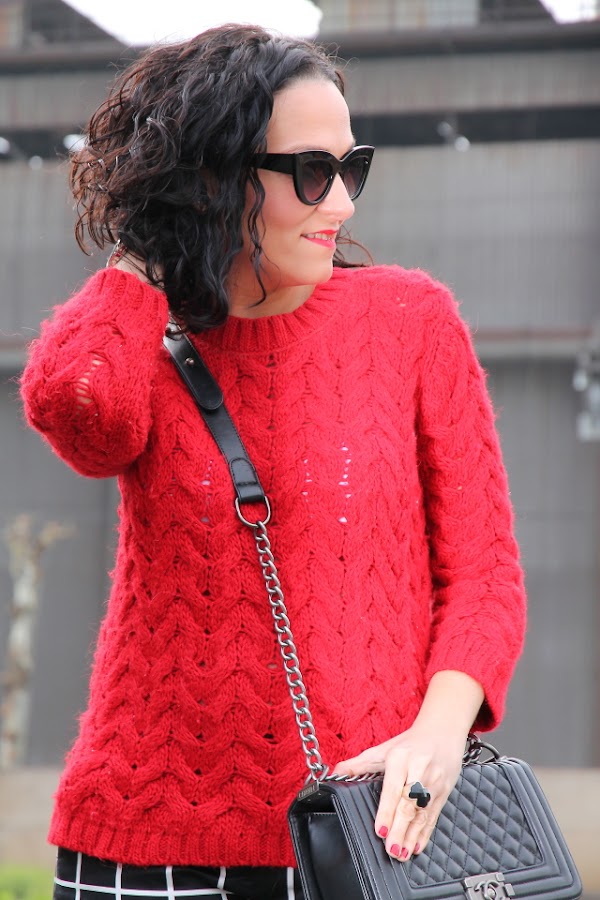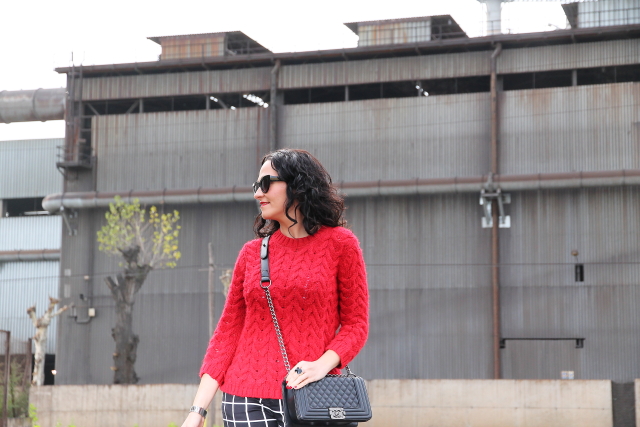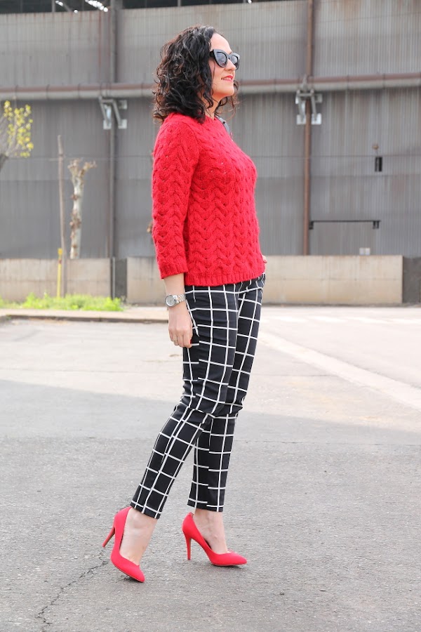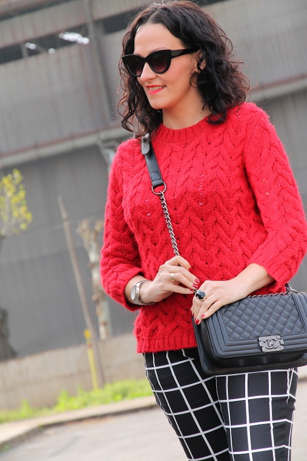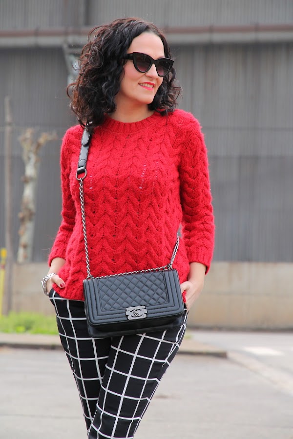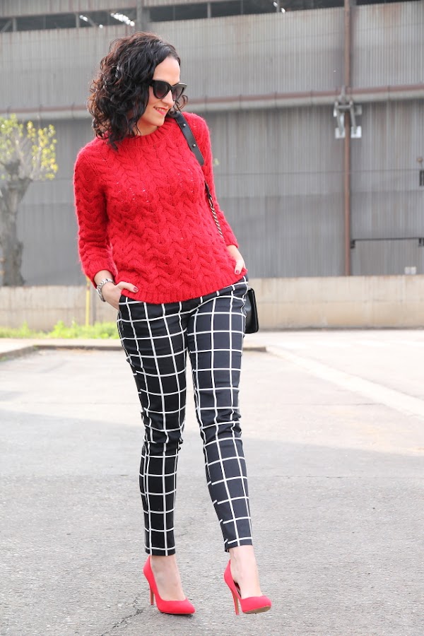 Los estampados de cuadros me gustan pero hasta ahora tan solo los había llevado en camisas o vestidos, sin embargo fue ver estos pantalones de cuadros y enamorarme de ellos. Aunque al principio pueden parecer un poco difíciles de combinar, la verdad es que es todo lo contrario. Hoy los llevo con jersey de punto rojo y stilettos en el mismo tono, pero en próximos post os iré enseñando otras combinaciones posibles.