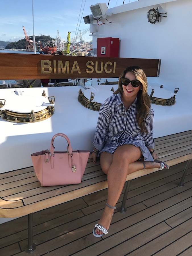 Lo combine en este caso, con sandalias de terciopelo y perlas y bolso rosa para darle color al look.