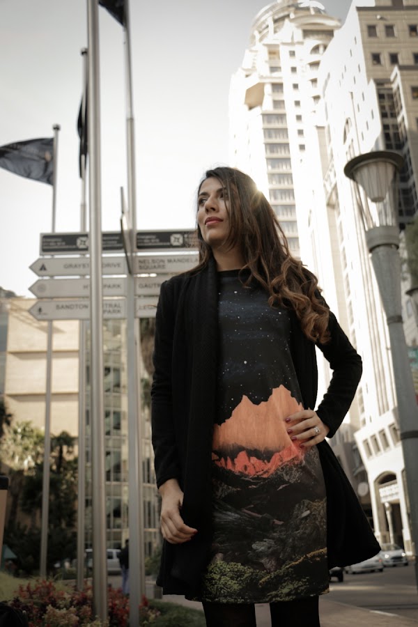 Hoy quise estar con un atuendo más elegante. Decidí acompañar el abrigo con este vestido precioso de las tiendas Nicci al cual lo bauticé ¨Vestido Espacial¨ porque su imagen me transporta al universo y me hace imaginar como son los otros planetas. Este es el perfecto look corporativo o una buena opción para ir a una cena por las noches.