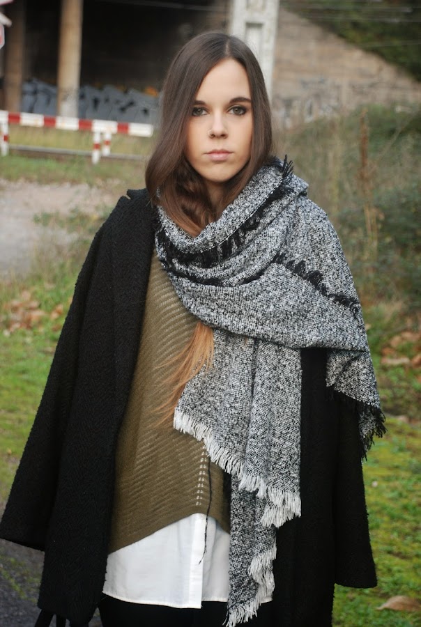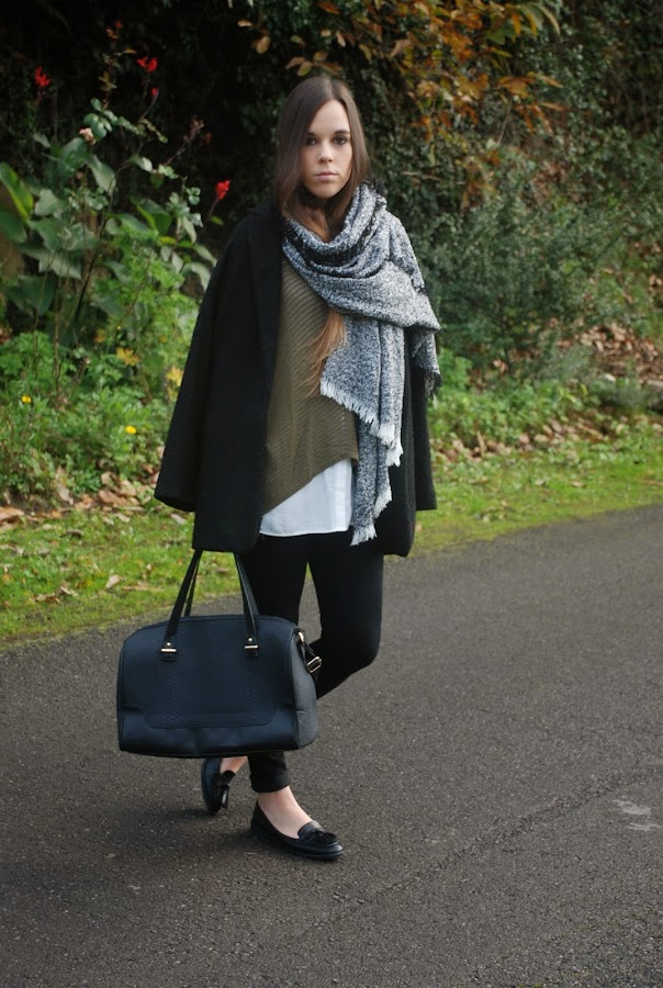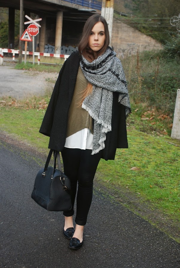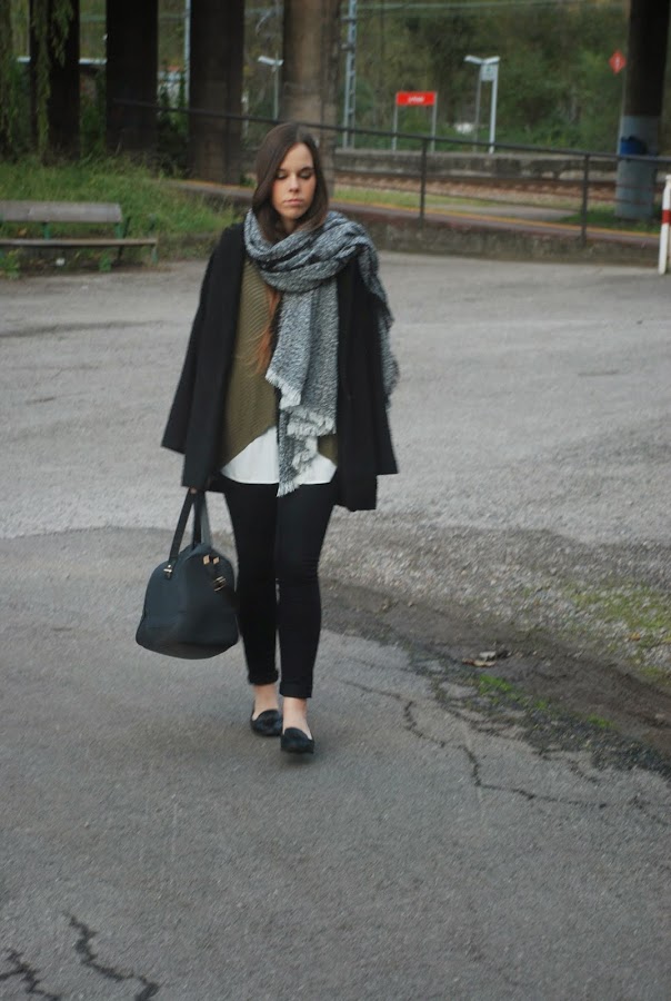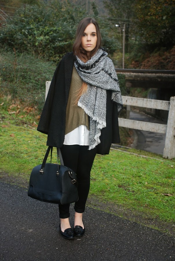 Hoy quiero enseñaros el oufit que llevé el sábado pasado para una tarde de compras. Como nos íbamos a pasar medio día de un lado para otro decidí apostar por calzado plano, así que me puse mis mocasines (sin medias porque soy muy guai, así que además de hacerme daño porque los estrenaba ese día, se me congelaron los pies porque no dejó de llover en toda la tarde). Para acompañarlos prendas sencillas y básicas que todas tenemos en casa: unos jeans negros, camisa oversize blanca, jersey (no se si podemos considerarlo jersey con lo finito que es), abrigo de corte masculino, bolso y bufanda (no puedo separarme de ella).