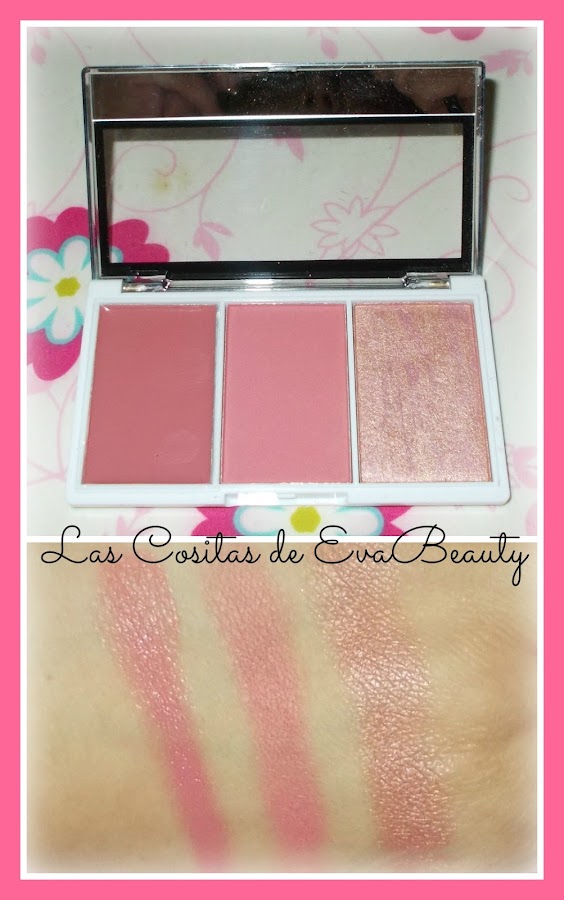 Primero, hay un colorete en crema, en un tono rosado, después un colorete en polvo, que aunque veáis que tiene micro purpurinas, aplicado en la piel no se aprecian apenas, como véis en el swatch dejando un tono rosado un poco más clarito y natural, y por último, el colorete iluminador, que me encanta!, deja un halo dorado satinado precioso, sobre una base tirando a coralina.