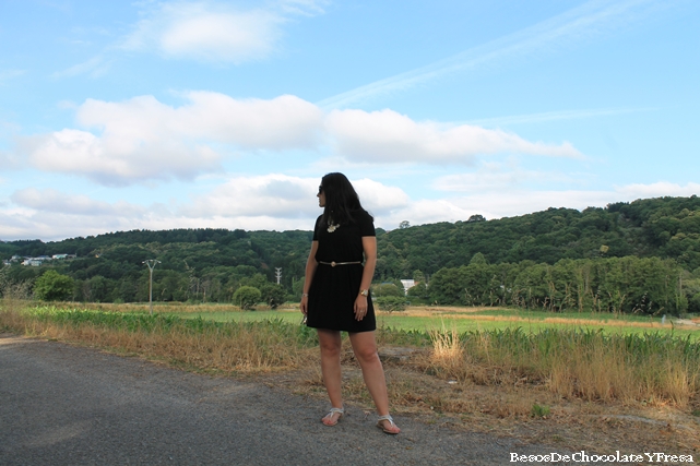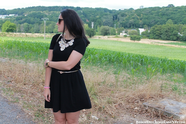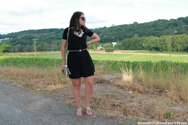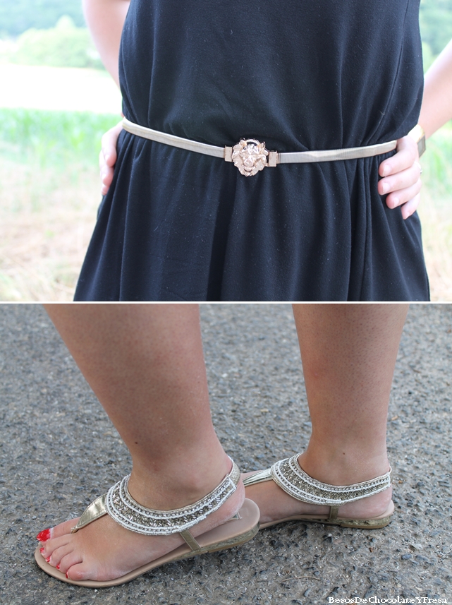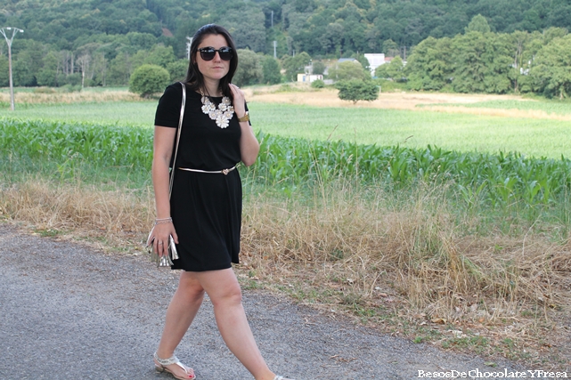 Hoy os muestro un look compuesto por tonos negros y dorados. Llevo vestido nuevo básico de Stradivarius en negro con detalle que le puse en la cintura gracias a un cinturón dorado con cierre de cabeza de león, sandalias nuevas también de Sfera de dedo con detalles de perlas rodeando el tobillo, bolso dorado y también collar nuevo de Nua Moda en color crema con formas de flores que le da todo el protagonismo al look y visten el vestido.