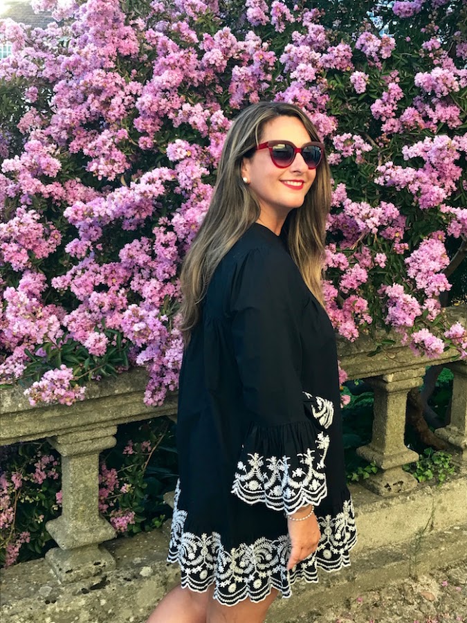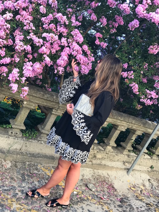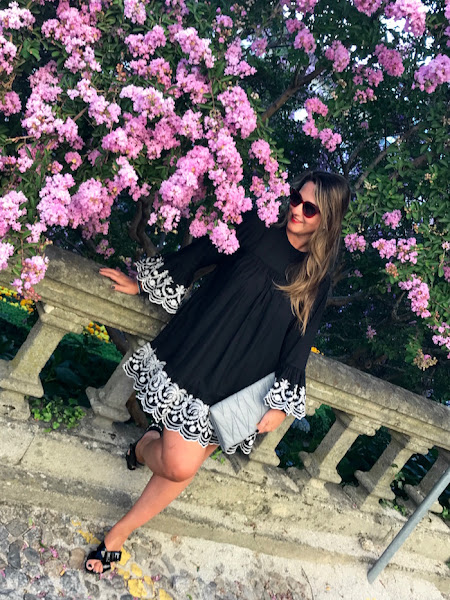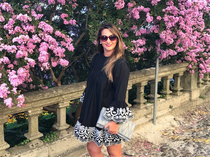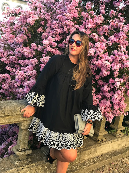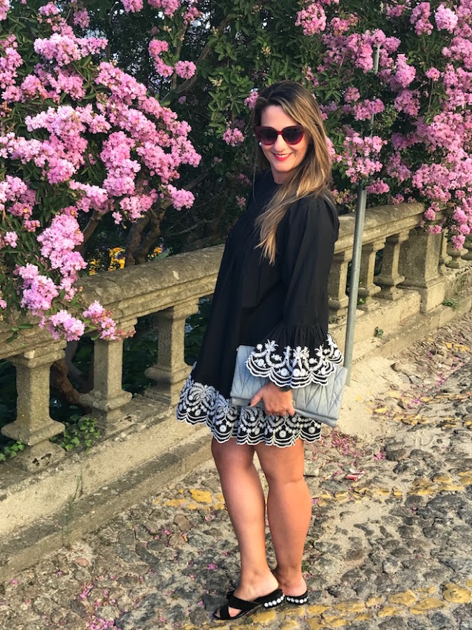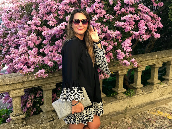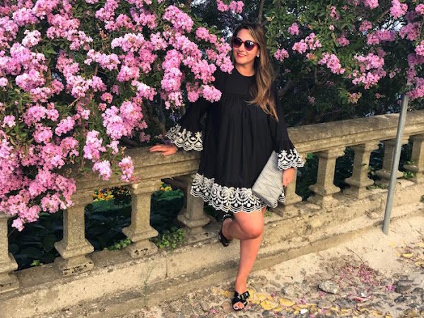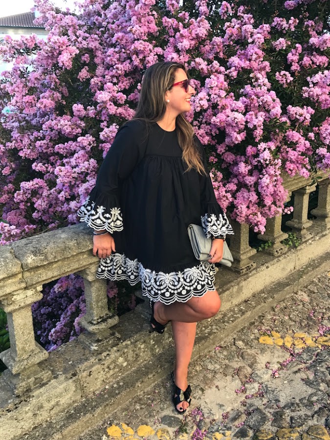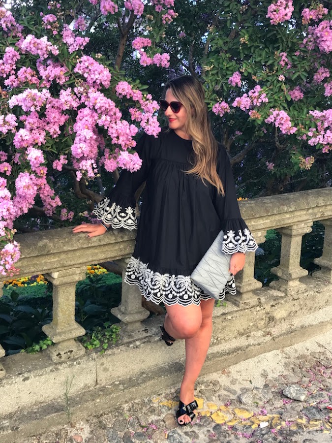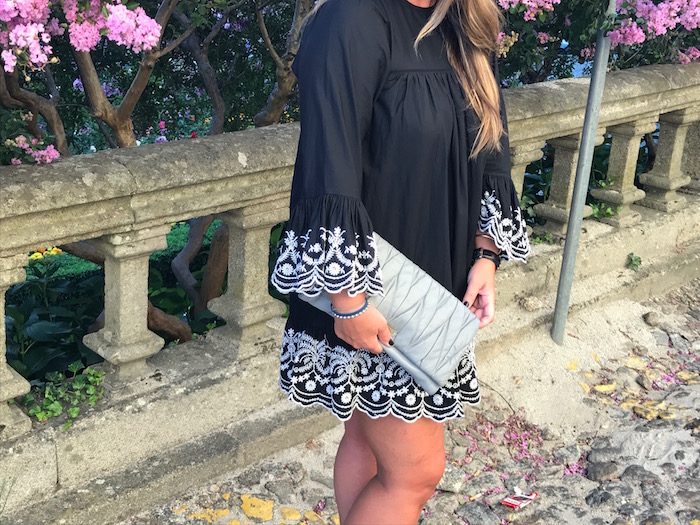 Para el look de hoy, yo he elegido un vestido negro con bordados en mangas y bajo en color blanco y lo combiné con sandalias joya y clutch en color gris.