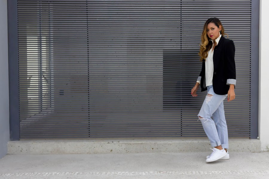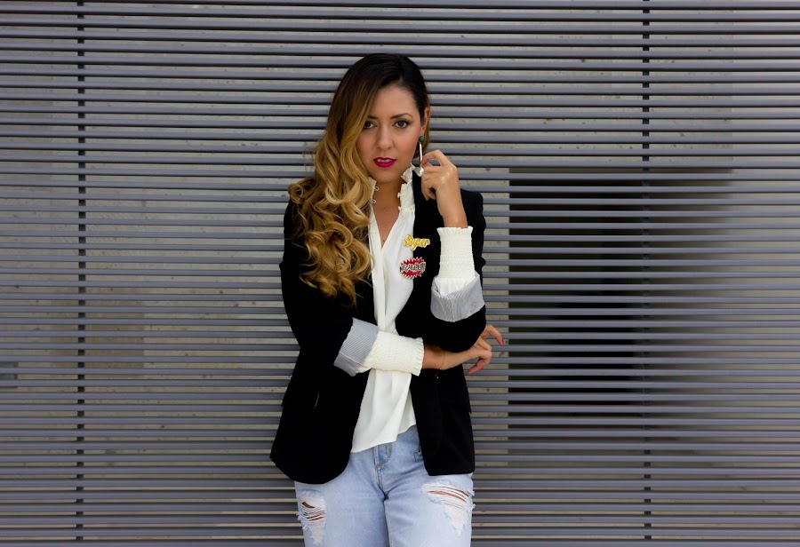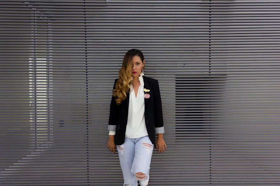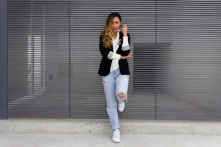 En está ocasión decidi combinarlos con unos boyfriend jeans rotos y una blusa un poco más formal pero que igual al desabotonar el cuello toma un aire mucho más relajado. El blazer es ya muy viejo pero sigue luciendo bien así que no he tenido que cambiarlo. Me pareció un detalle divertido sumarle los pibes a una prenda formal y que puede a veces hasta ser aburrida.