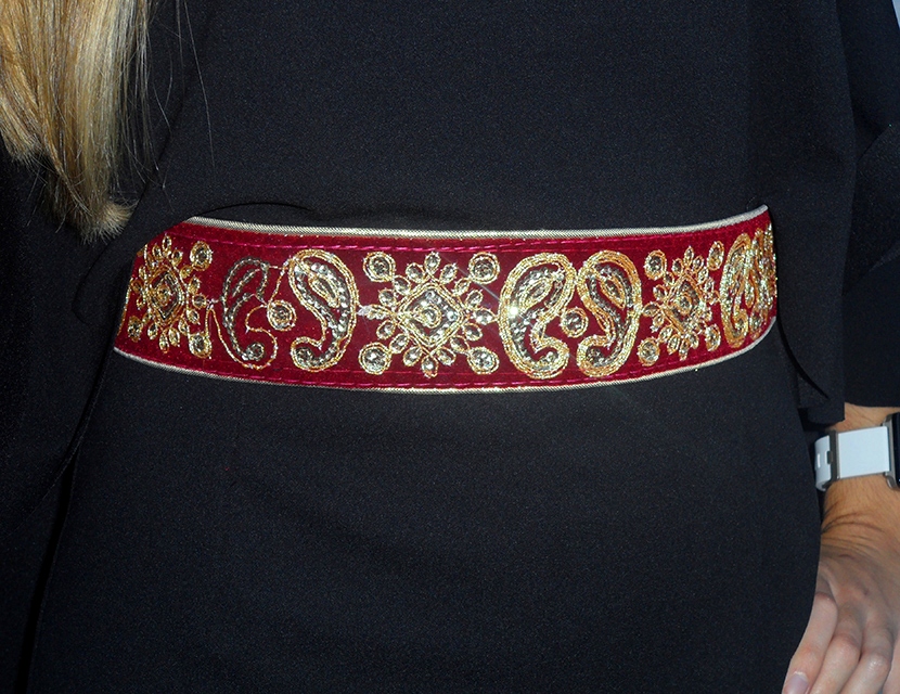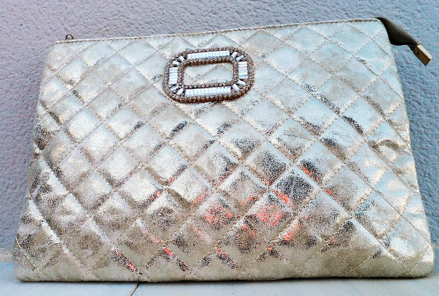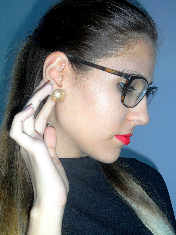 Lo he combinado con un cinturón a modo de fajín, unos salones negros y como complementos un bolso dorado a juego con los pendientes.