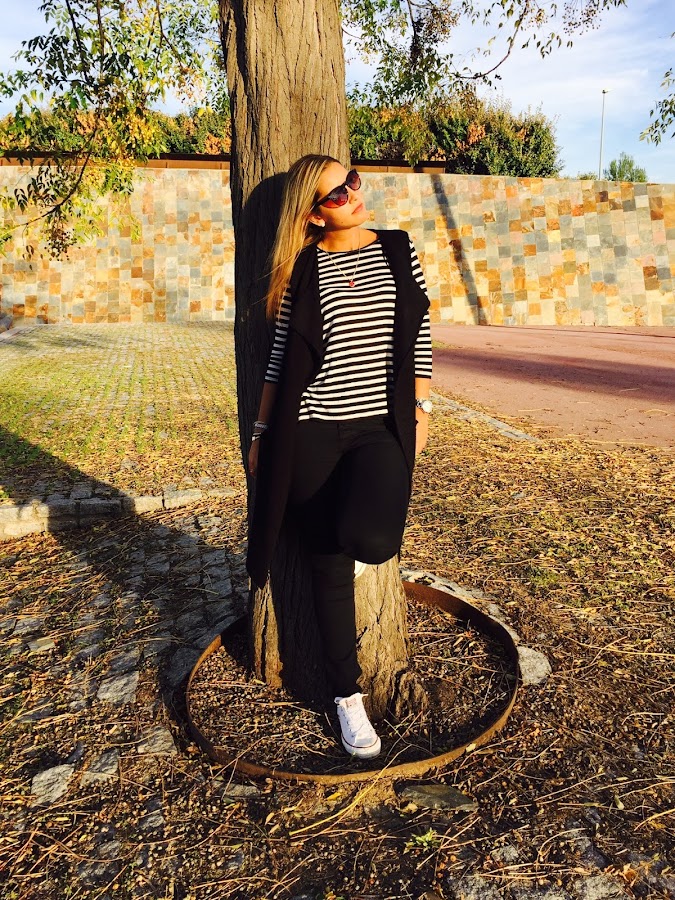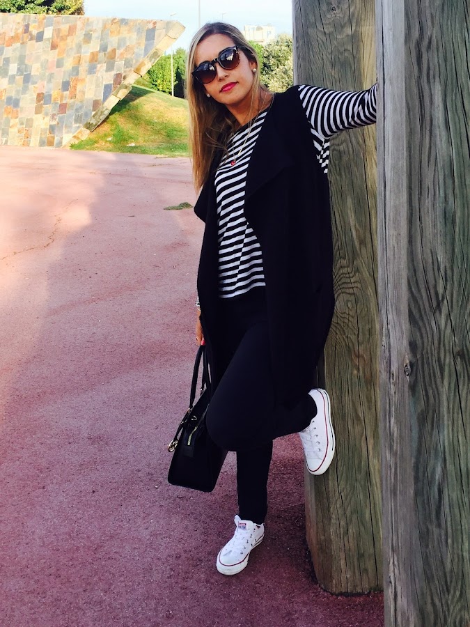 Hoy os traigo un look casual perfecto para el entretiempo y con una de las tendencias de la temporada: el abrigo sin mangas. Lo combiné con unos pantalones negros y una camiseta de rayas. Para dar un toque casual al look me puse mis converse y mi bolso negro de Michael Kors que llevaba tiempo queriendo hacerme con él y seguramente vais a verlo en muchos más looks.