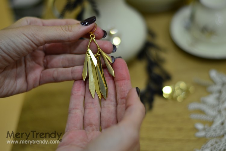 Como complemento, unos preciosos pendientes dorados que cuelgan con rayos en vertical que terminan en punta.