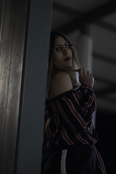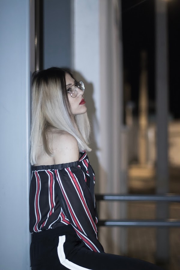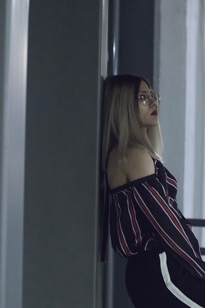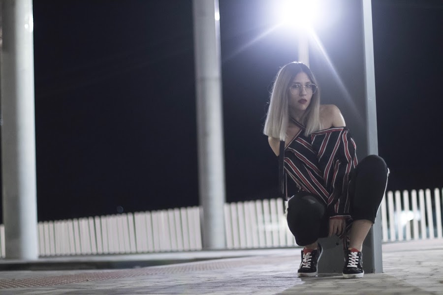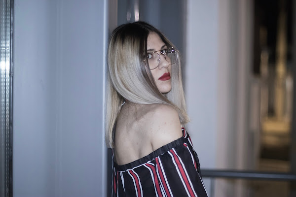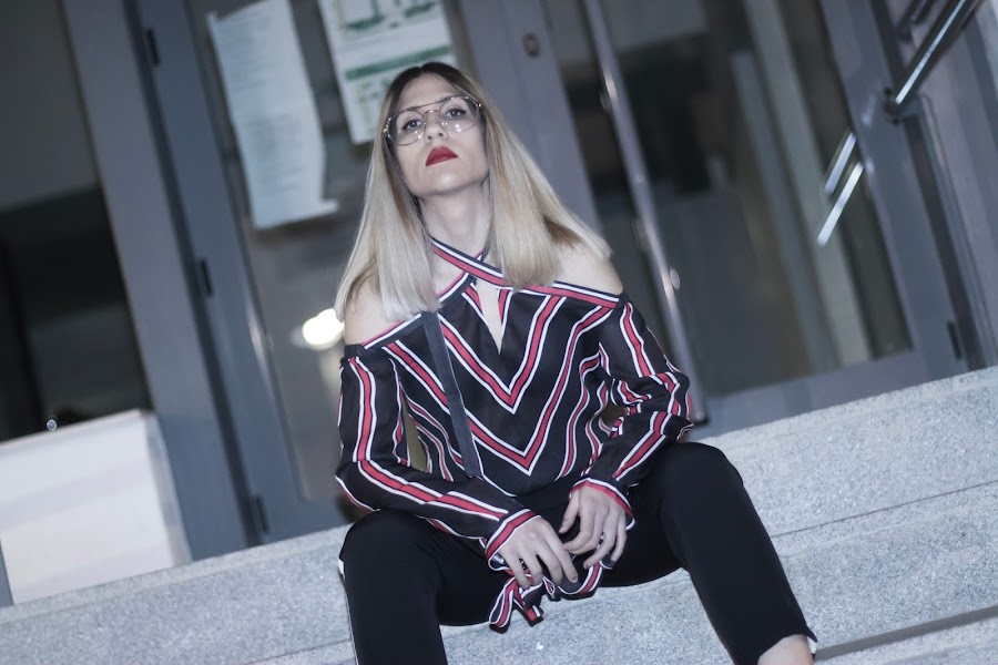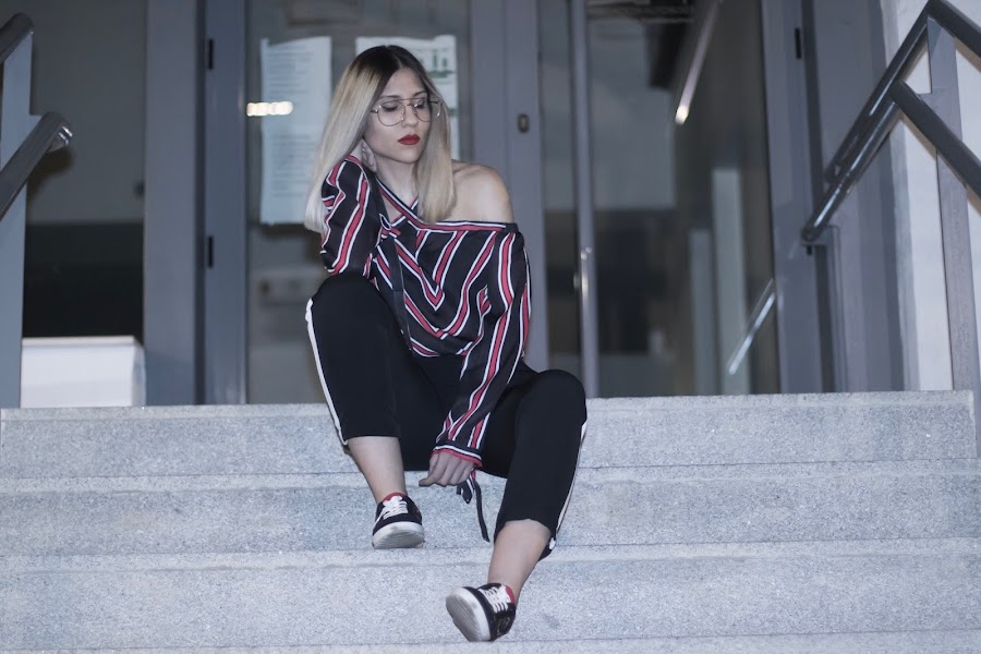 En cuanto al look, llevo una blusa negra de rayas rojas y blanca de LOOKBOOK STORE, de hombros descubiertos y escote cruzado anudado en la nuca, mis pantalones tailoring negros con una raya blanca lateral y mis zapatillas black jack de Doriginal.