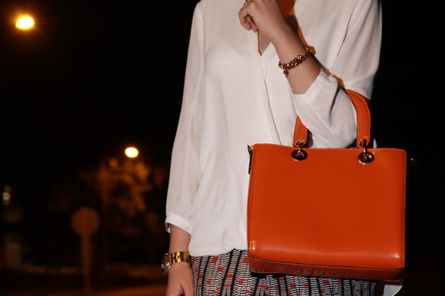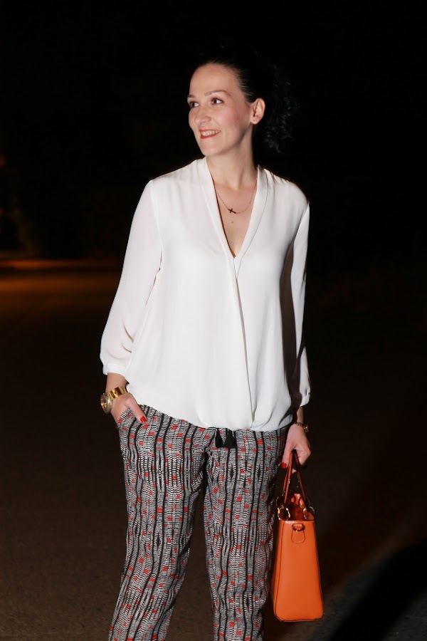 Otro día que se me hicieron las mil y acabé haciéndome las fotos por la noche, si es que ya lo digo yo que necesitaría días de 30 horas para llegar a todo. El look que os muestro es otro de mis working outfits, como otras veces he confiado en una blusa blanca asimétrica y pantalones flojos. Como los pantalones llevan tonos en naranja, me he decantado por un bolso en el mismo tono y complementos sencillos en dorado y negro.