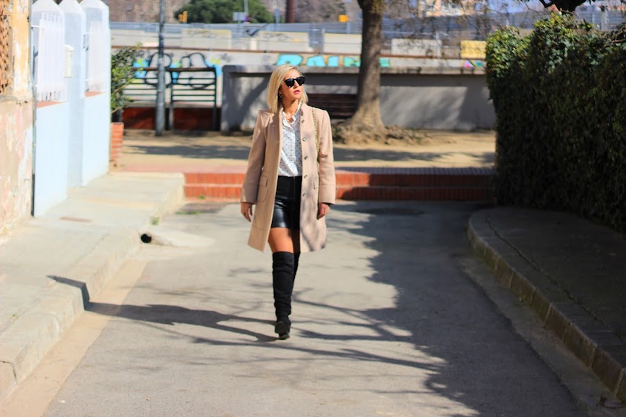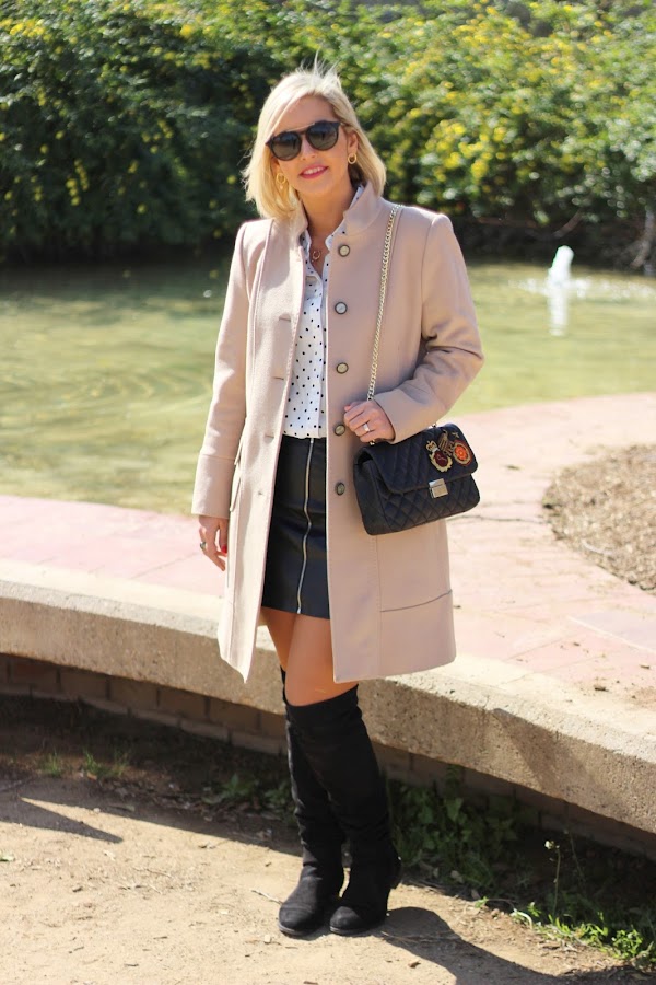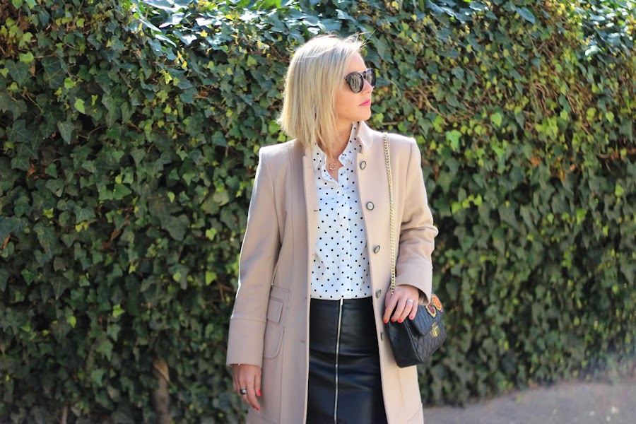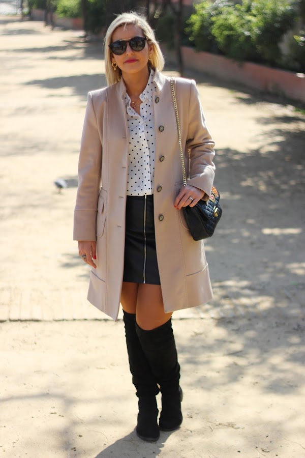 Hoy os traigo un look muy sencillo y con tres colores que encajan a la perfección: el negro, blanco y beige. En el look de hoy llevo mi nueva camisa blanca con topos negros, que es super tendencia esta temporada, que combiné con una falda negra de piel y mi abrigo beige. Los accesorios del look fueron mis botas negras por encima de la rodilla y mi bolso negro con parches.