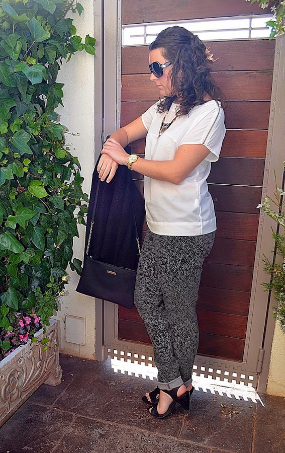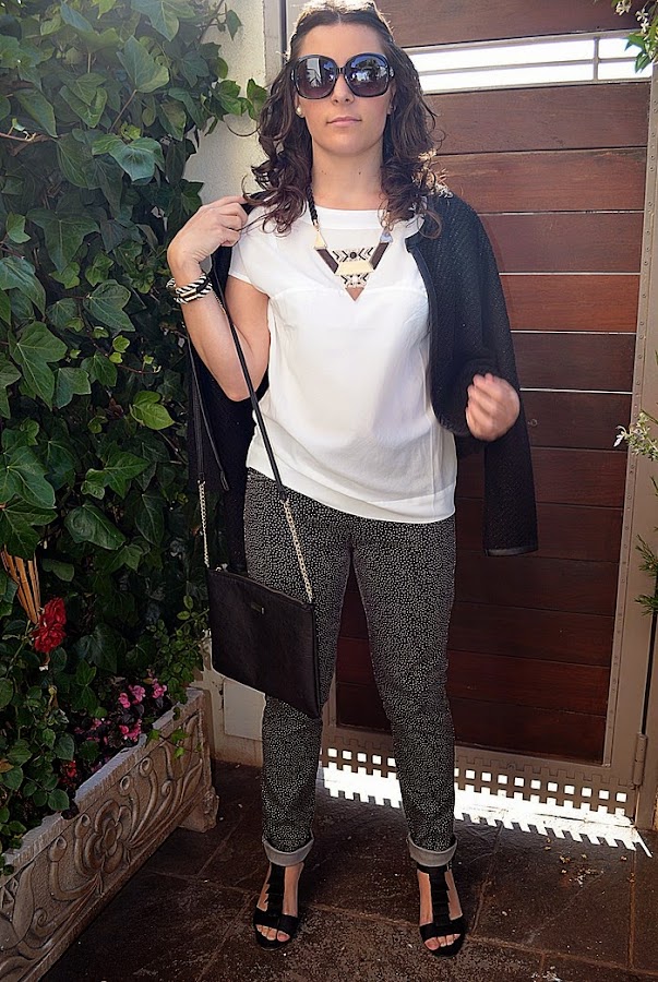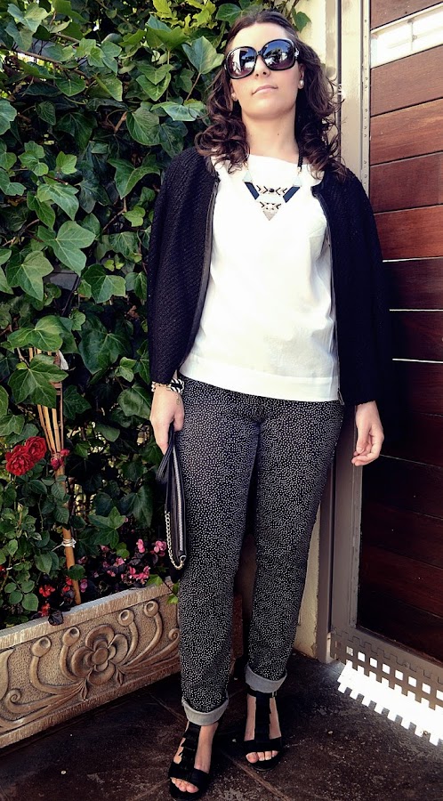 Hoy os muestro un look básico por los colores, blanco y negro, es una opción que nunca falla. Todo el outfit en sí es con prendas de otras temporadas, es un popurri, pero a mi me encanta. Los pantalones son con estampado de lunares. Los compré el año pasado en Stradivarius y ahora me vienen un poco grandes...aún así son muy reutilizables y más ahora que la tendencia de los topos ha vuelto con fuerza. Los he combinado con una camiseta básica blanca y la chaqueta de punto con detalles brillantes (aunque en la foto no se aprecia)que me compré para estas navidades.