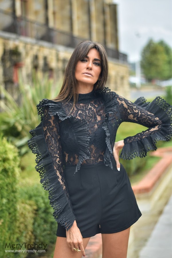 De un lado, un mono corto con encaje y transparencias, que bien podría llevarse con un sujetador negro debajo (como he hecho yo), mostrando la lencería, o con uno en tono visón para, precisamente, provocar el efecto contrario y que no se note que llevamos ropa interior.