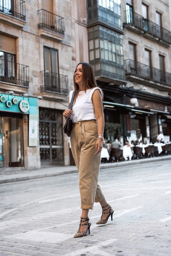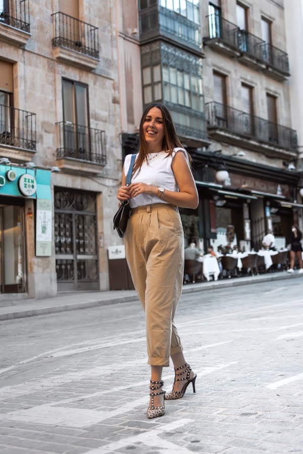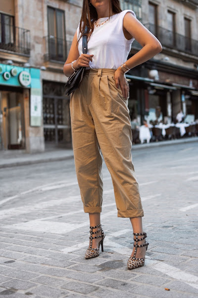 Y volviendo al look, los slouchy siguen siendo los protagonistas de los looks y no han dejado de ser tendencia. Cambian su textura, ya que no solamente se centran en ser jeans, ahora los podemos encontrar en un corte más elegante como el que he elegido, un slouchy de piel de melocotón en color beige oscuro que combinado con una camiseta de hombreras, también tendencia, crean el combo perfecto. La camiseta no es demasiado marcada, ya que dentro de la moda de las camisetas con hombreras, nos encontramos infinidad de volúmenes. Cuanto más volumen en la parte de los hombros y las caderas, crearemos un efecto de silueta de reloj de arena al afinarse así la cintura. Y de los tacones ¿qué os cuento? Son de esos que tengo en el armario desde hace un millón de años y que no me pongo por miedo a matarme. Me encantan los tacones, pero a la vez soy muy de ir a lo cómodo. En esta ocasión he incluido algunos tacones en mi maleta, quería darle un toque más elegante a los looks y como el viaje incluía planes tranquilos, fueron una gran elección.
