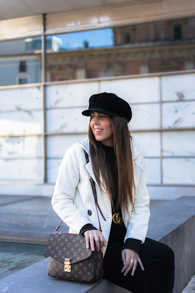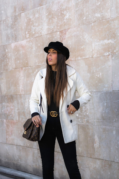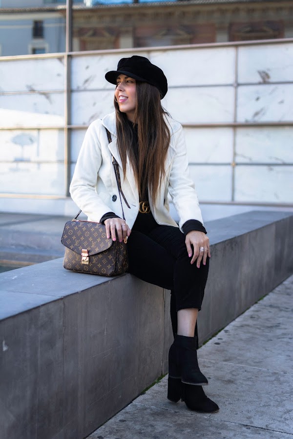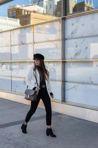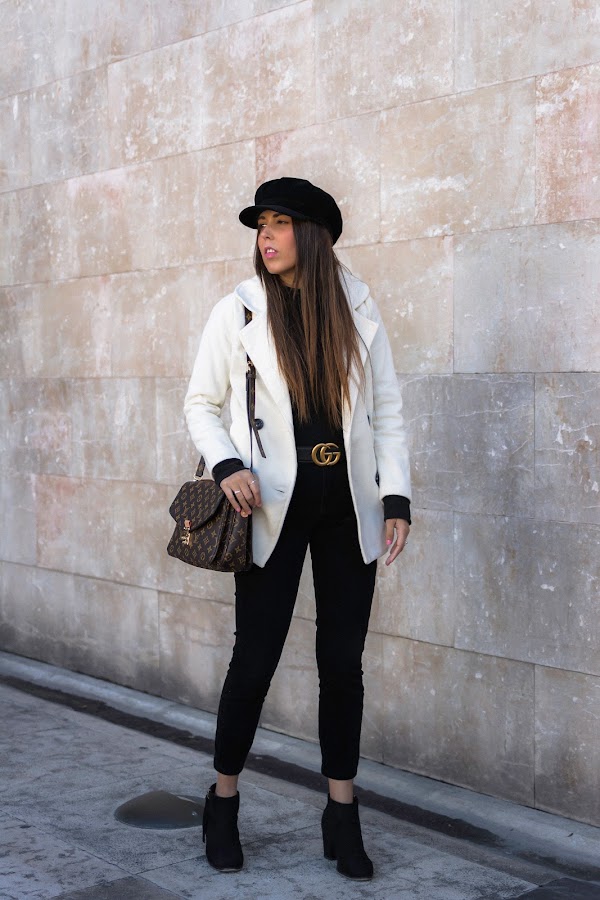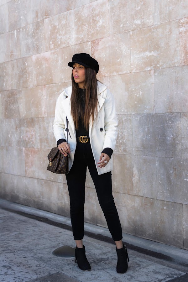 Lo combiné con un total black en pantalones pitillo, gorra baker boy y botines. También el detalle del cinturón en color negro con dorado y por último, uno de los bolsos favoritos de mi armario.