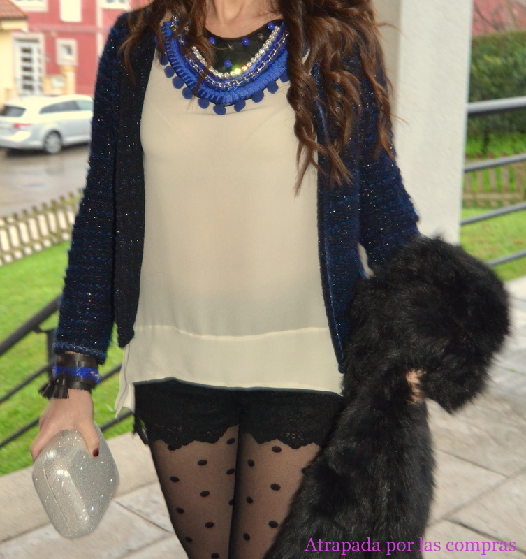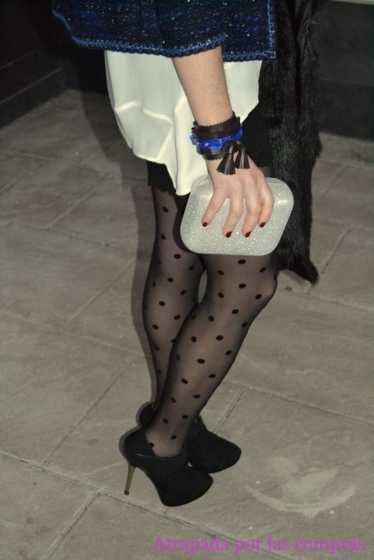 Para un look tan sencillo hacía falta unos complementos especiales y con fuerza. Así que sin dudarlo elegí este collar azul y negro con la pulsera a juego de la diseñadora asturiana Tamara Díaz, me encantó el detalle del strass, los pompones y los pinchos, sin duda son los protagonistas del look, un maxi anillo de plata de Ardura Joyeros y un cluth plateado. Qué os parece el resultado?