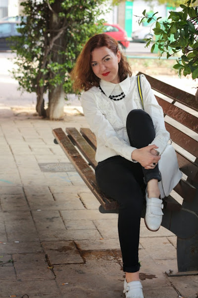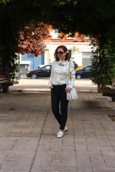 Es un conjunto formado por básicos: vaqueros negros, camisa blanca, aunque con el detalle de las flores, los bluchers blancos y un bolso bandolera también el blanco.