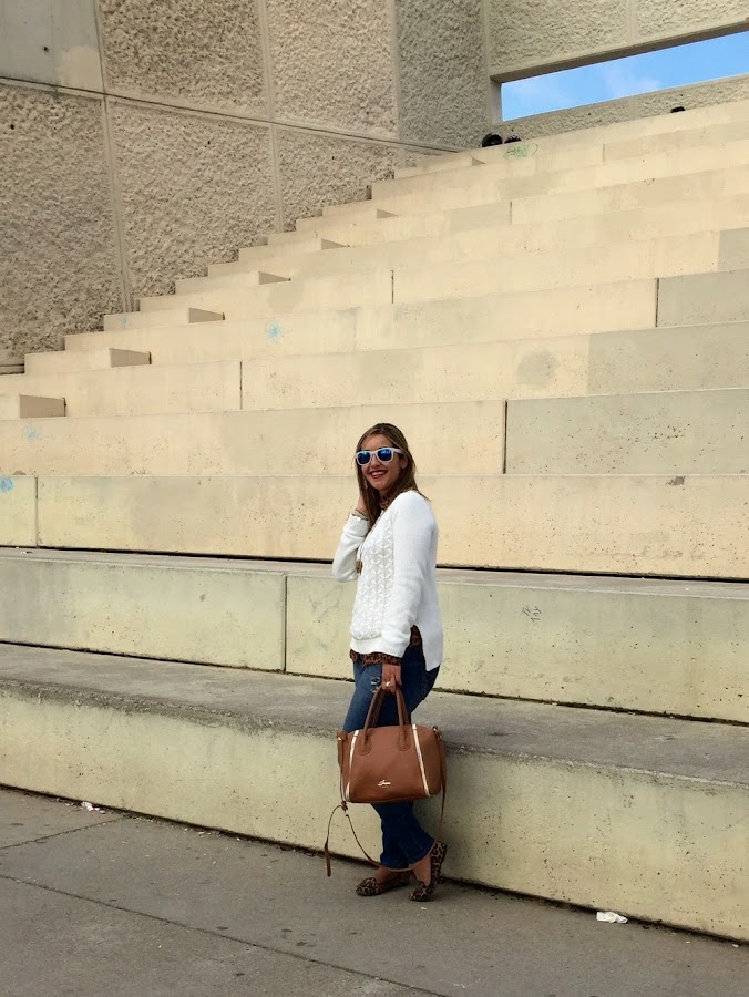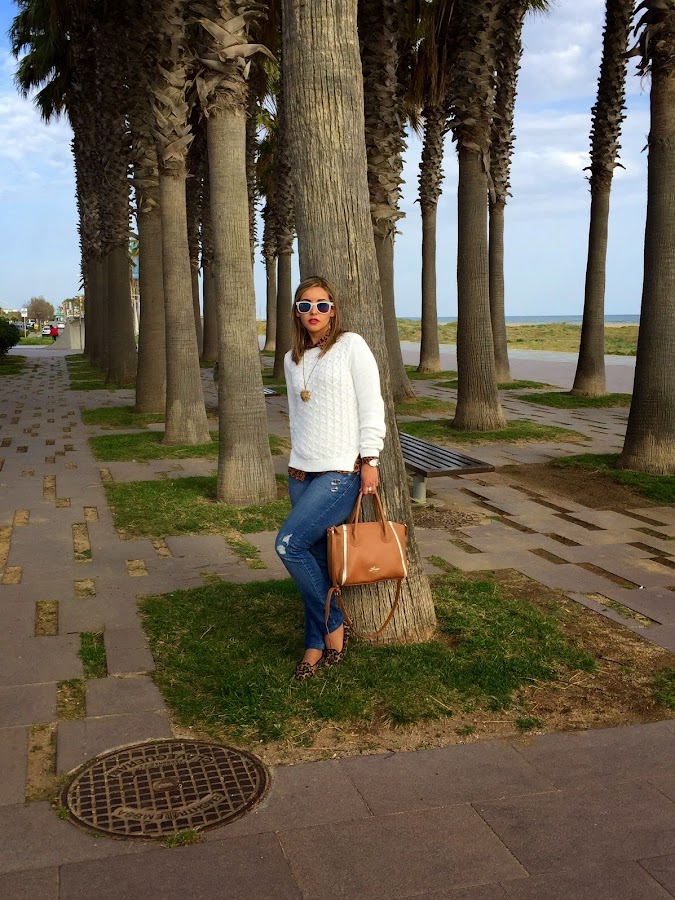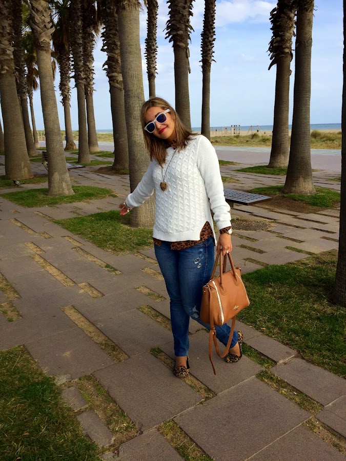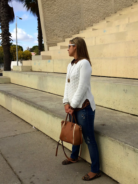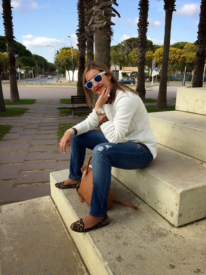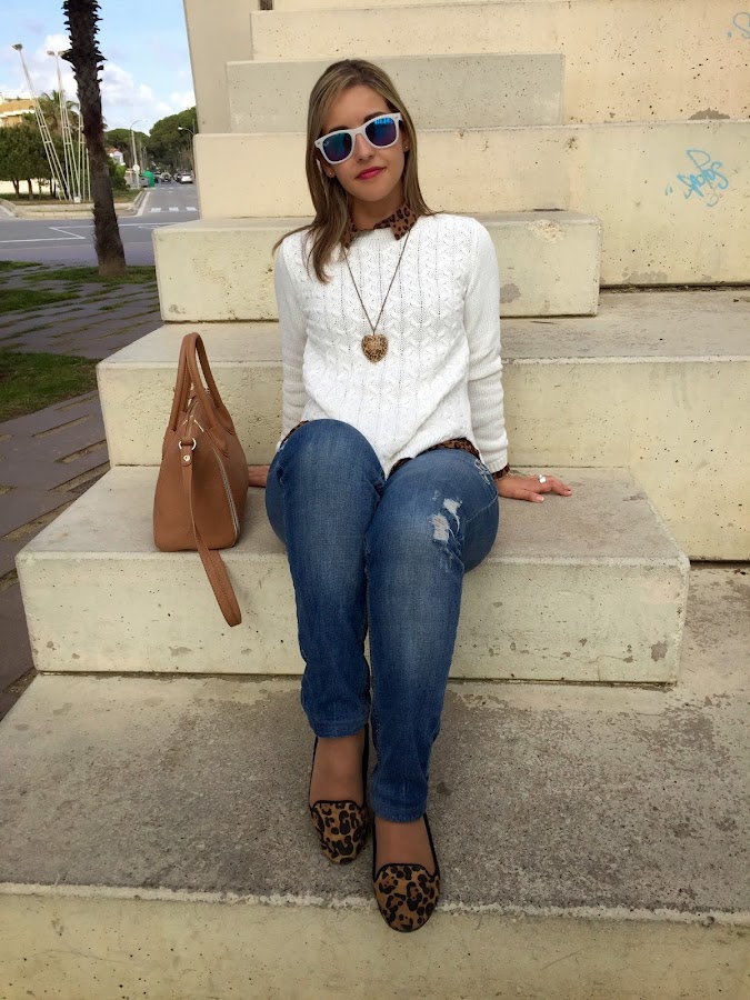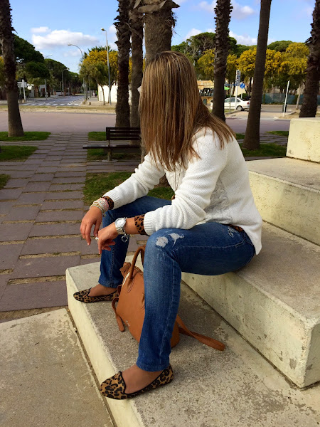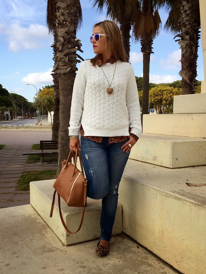 Good night sweeties! How did the weekend go? I hope it were gone well and you could do a lot of things. Today I show you a casual and simple outfit that it"s perfect when you have to do a lot of things and you need to be comfortable. In the outfit, I wore jeans, white sweater and a animal print shirt. The accessories of the outfit were animal print slippers and a beige bag of Guess.