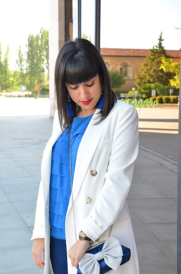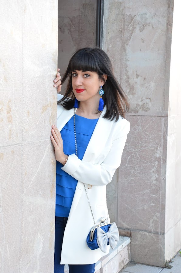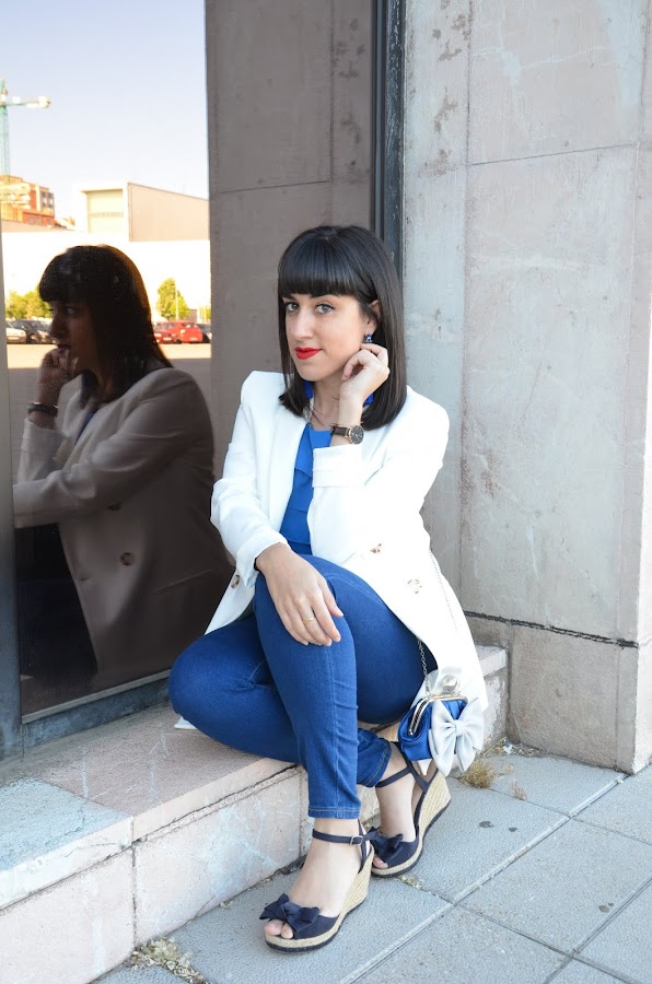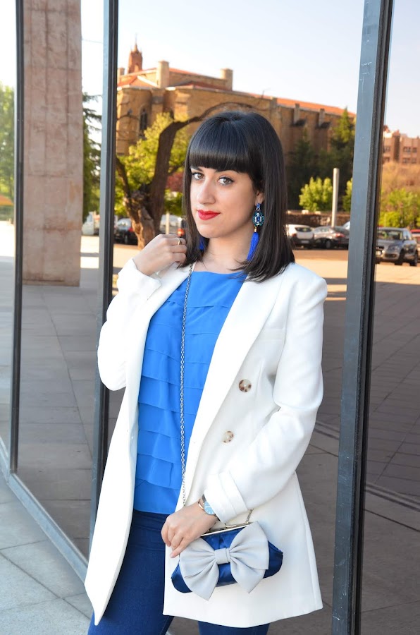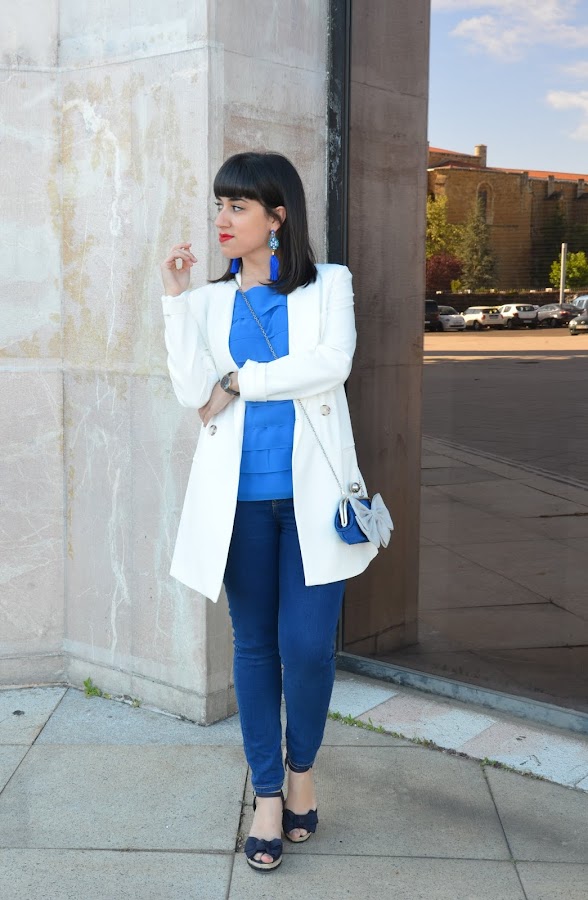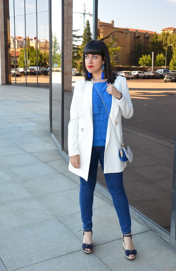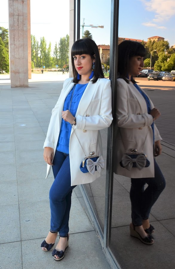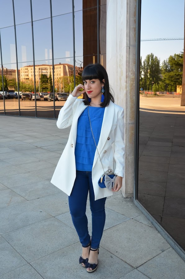 La verdad que yo este me lo he tomado de relax, que de vez en cuando viene de maravilla, y aprovechando que ayer tenía cena de amigos, hicimos unas fotos con este look que combina el blanco con el azul klein.