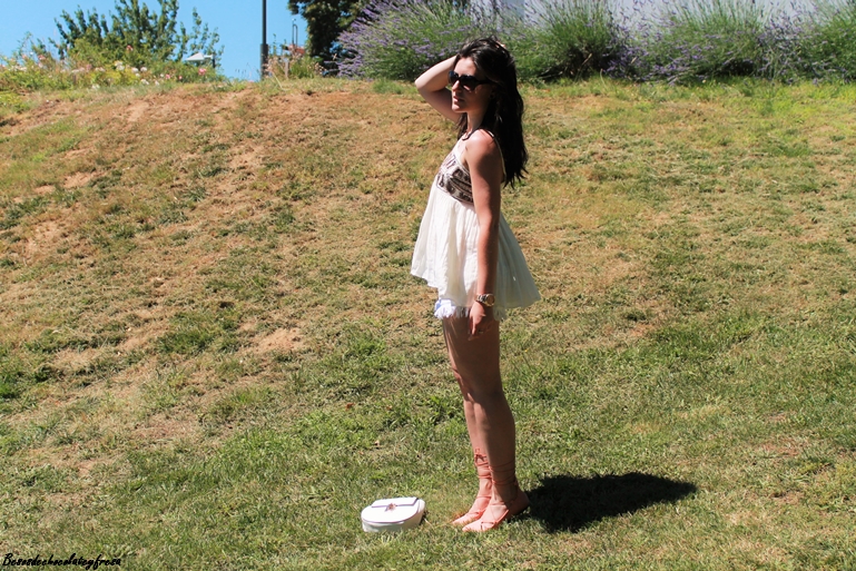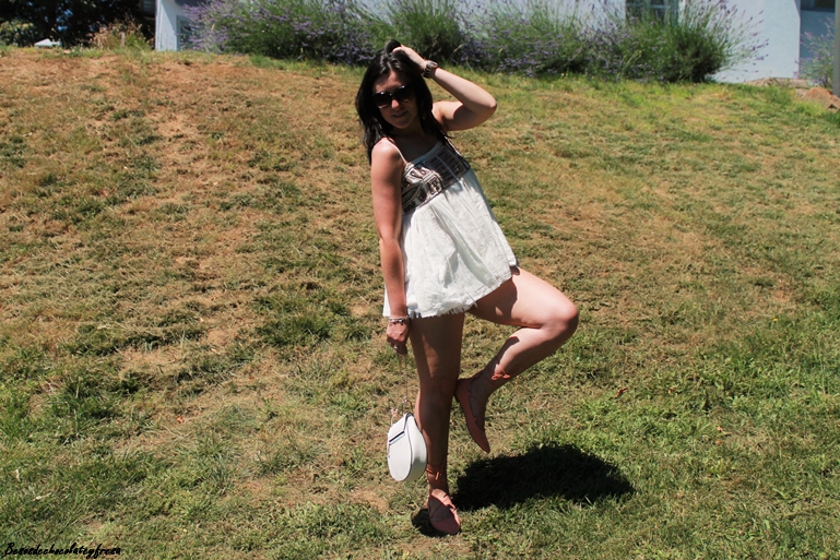 Llevo camiseta canesú en blanco con abalorios en el pecho, flare shorts cortitos, lace-up en color y bolso en blanco que le estoy dando mucho uso por lo cómodo y práctico que es.