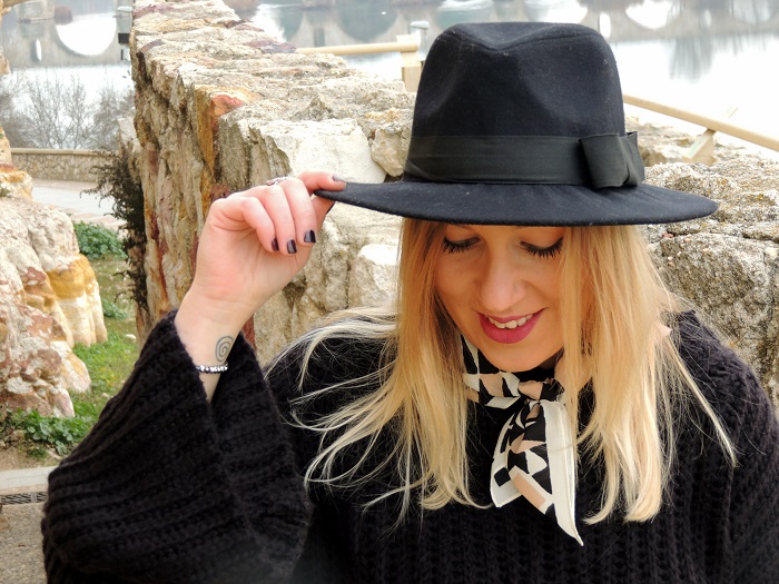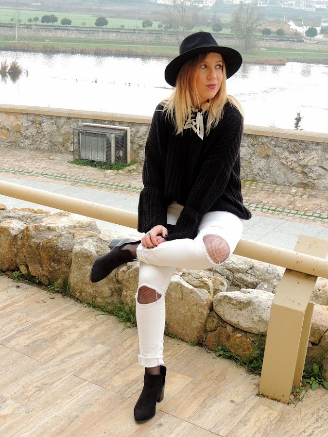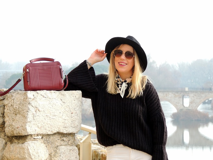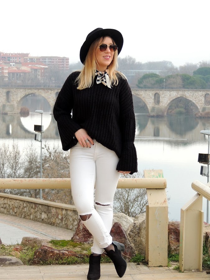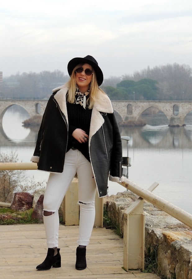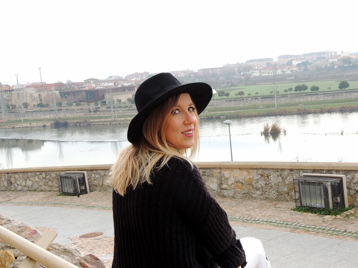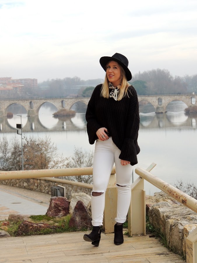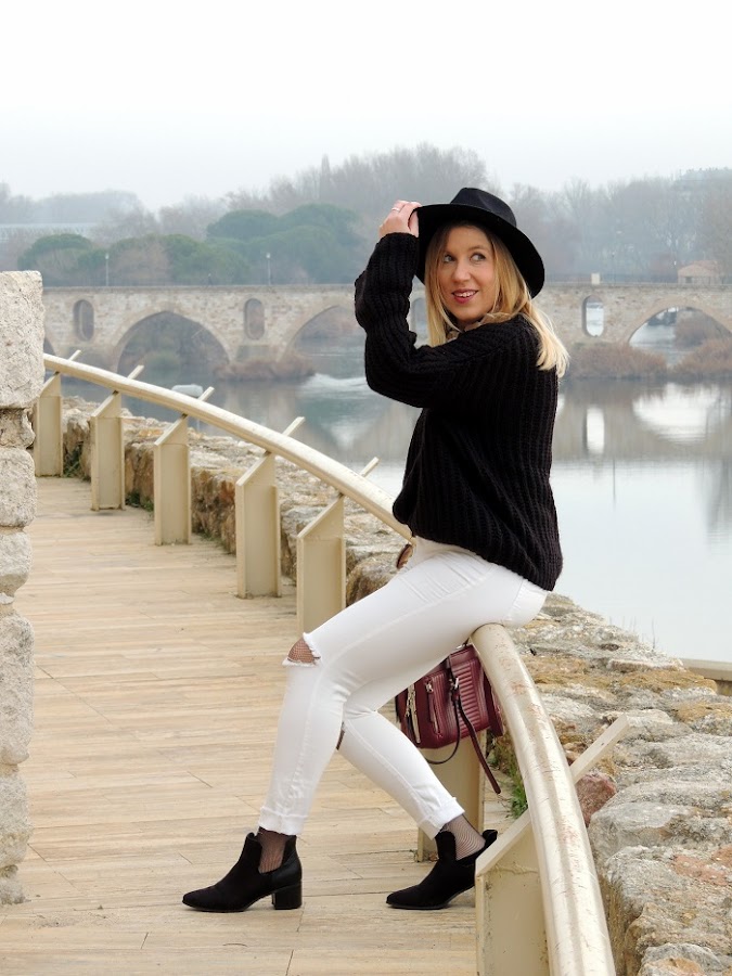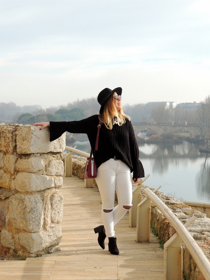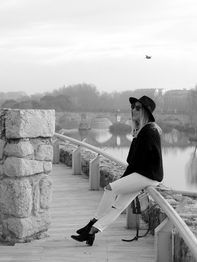 El invierno está haciendo acto de presencia a lo grande por toda España, frío, mucho frío, heladas, nieve, temporales... en Zamora lo que es algo muy peculiar en estas fechas es la niebla, muchos nos quejamos de ellas, pero hay que reconocer que tienen su parte mágica, para disfrutar de ella fuimos a la muralla a captar estas fotos, con el puente de piedra de fondo, mientras que el sol peleaba por dejarse notar. El look que escogí fue en blanco y negro, pitillos rotos con medias de rejilla debajo, jersey gustosín con las mangas de campana, sombrero, botines molones y toque de color en el bolso :) Espero os guste y disfrutéis de las fotazas que me hizo mi querida @elvipepel