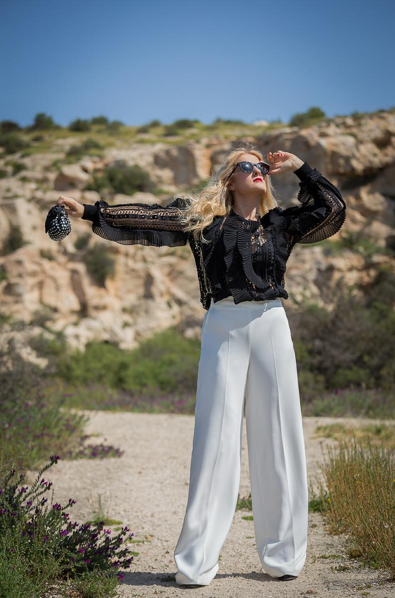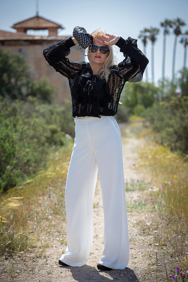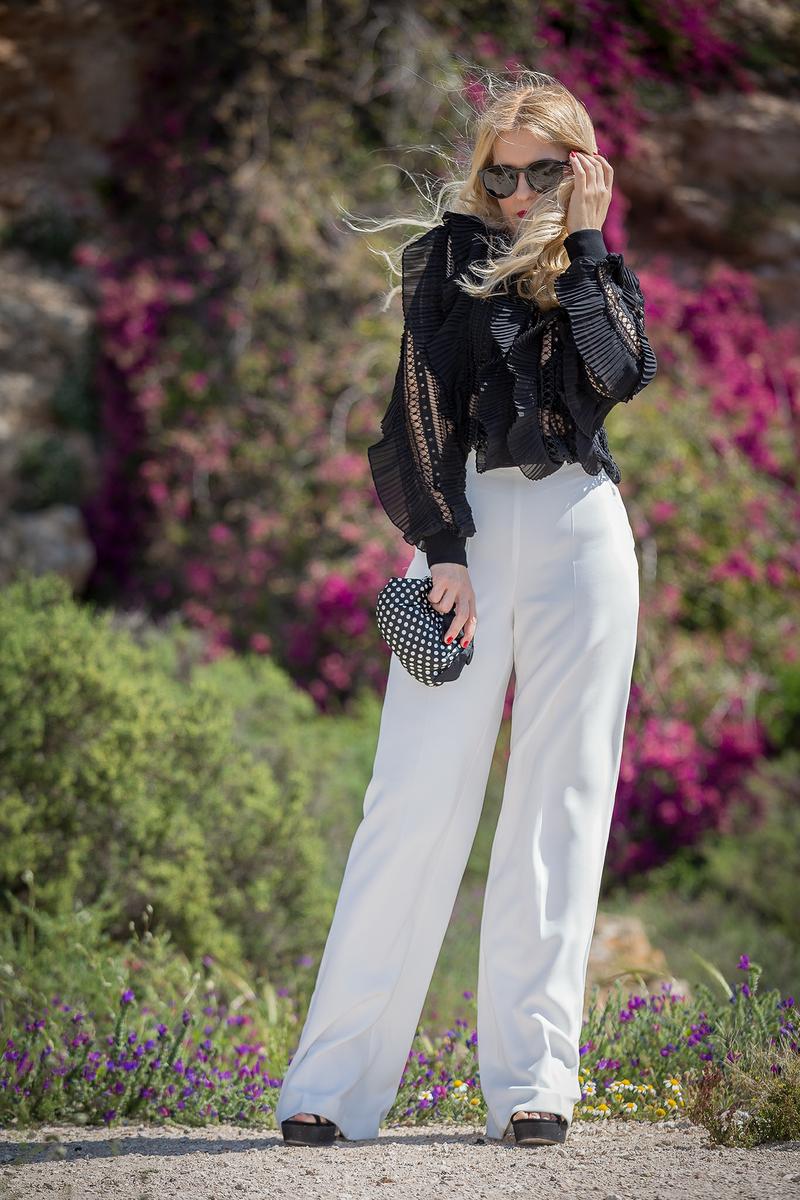 Para la ocasión elegí un black & white sencillo pero con un aire flamenco. Un suéter negro con volantes plisado de BYMHAY super lindo, reconozco que fue amor a primera vista, lo compré a través de internet y fue todo un acierto. Me puse mis pantalones blancos de temporada de la nueva colección de SFERA, un MIX perfecto. Y el complemento ideal, un bolsito de mano de lunares para marcar tendencia.