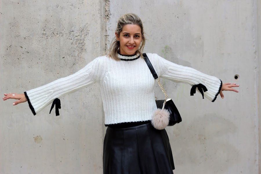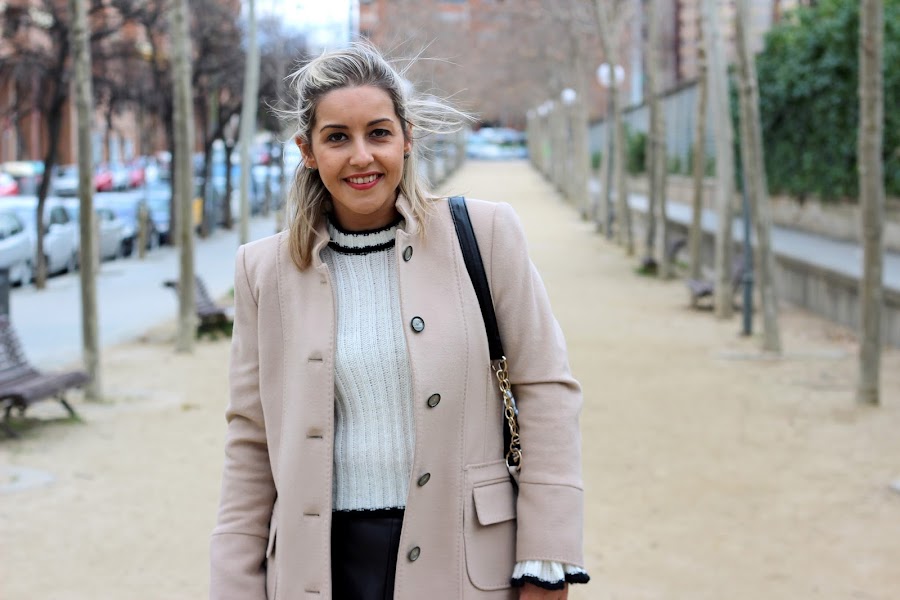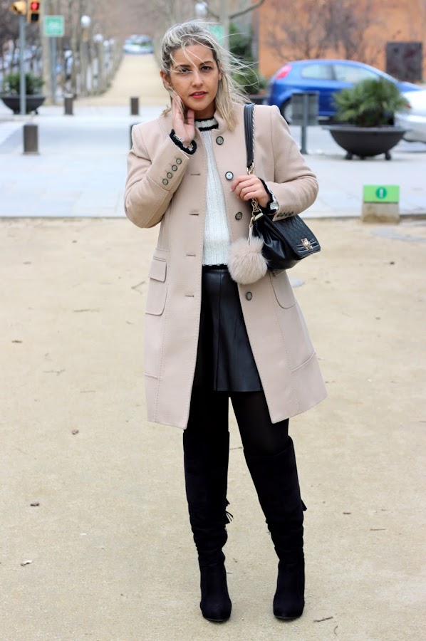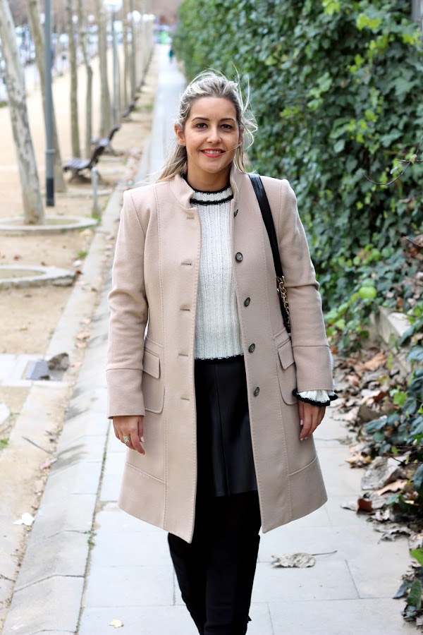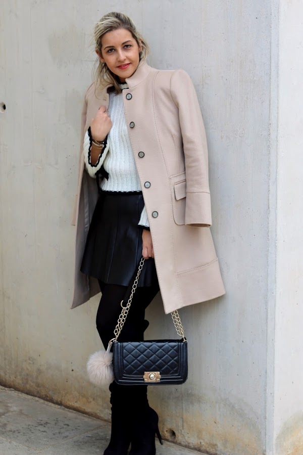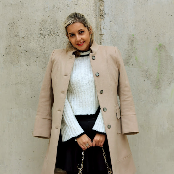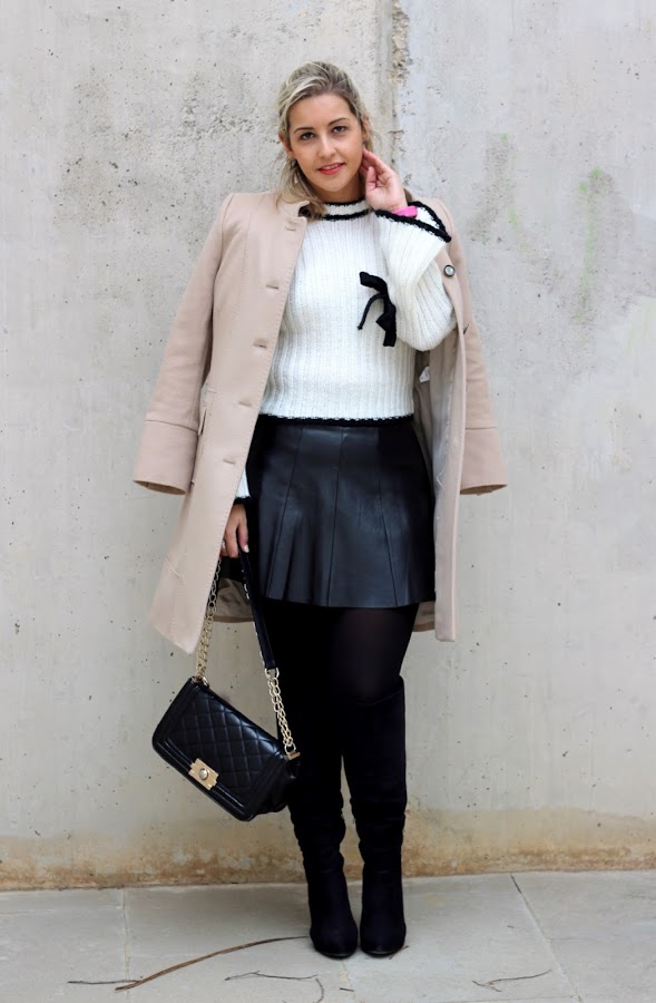 Today I show you a perfect outfit to wear to work during winter. I wear my new white sweater with little details in black that is very warm and I liked for its flared sleeves and the details of the ties in the sleeves, one of the trends of this season. I wear with a black leather skirt and a beige coat, a basic that shouldnt miss in your closet. The accessories of the outfit were black boots over the knees and my black bag similar to Chanel.