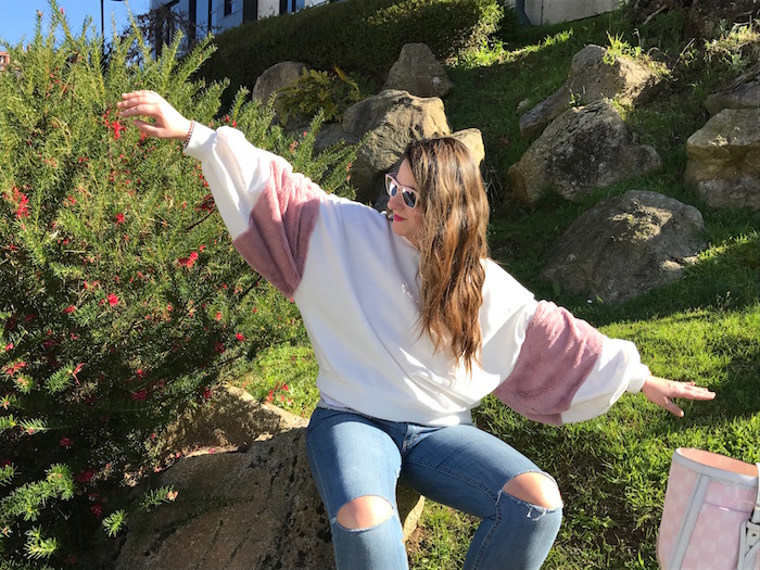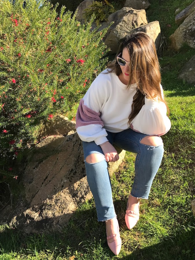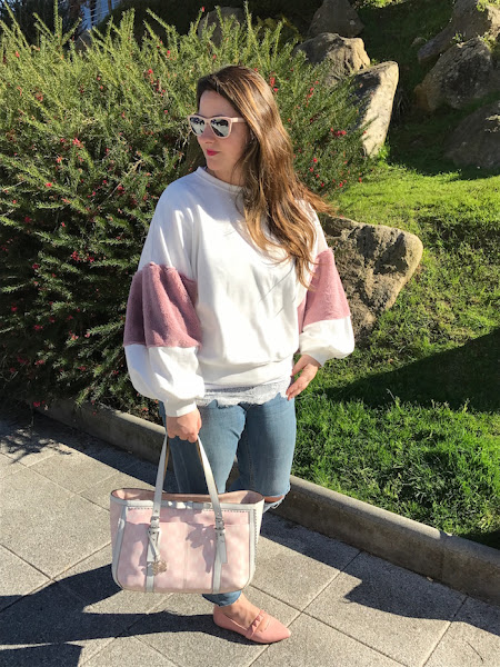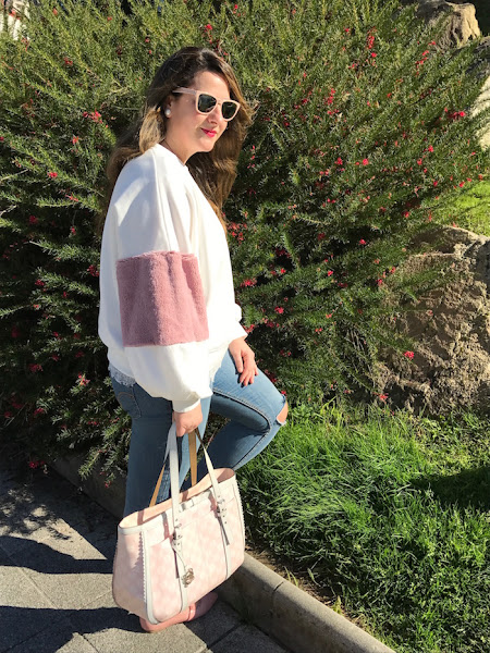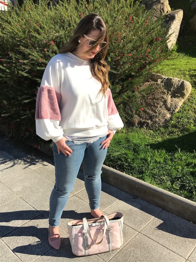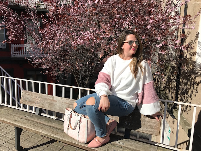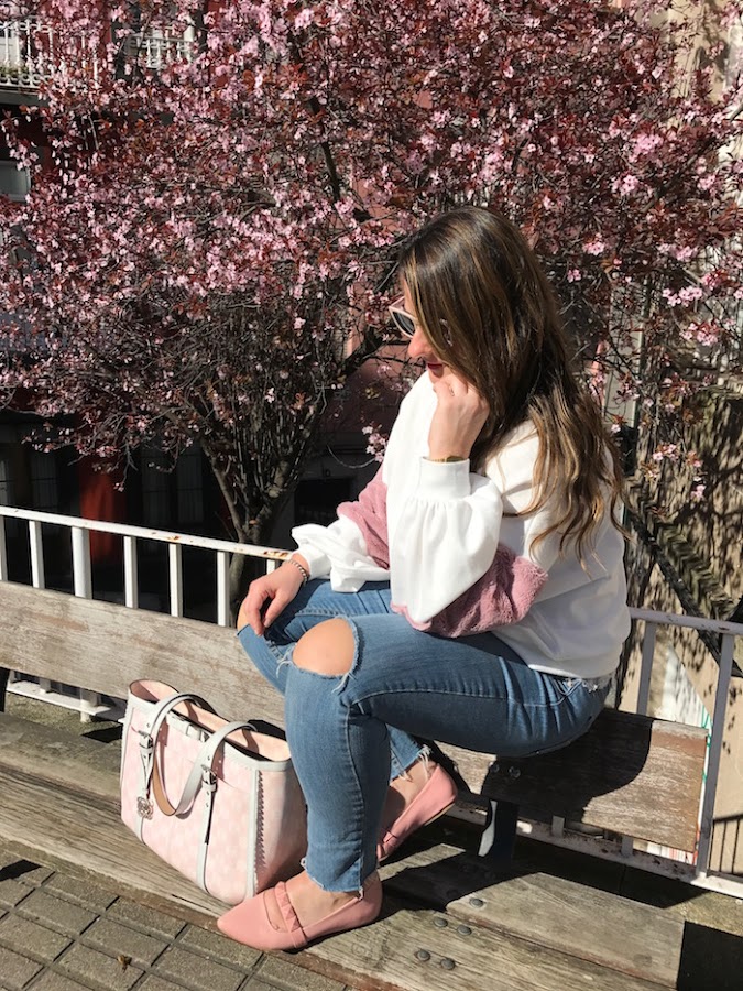 La combiné con jeans rotos en la rodilla. Mis levis favoritos y traídos de mi viaje a NYC, creo que voy a tener que volver a comprar mas.. Como complementos, bailarinas joya en color rosa y bolso en los mismos colores que la sudadera: blanco y rosa.