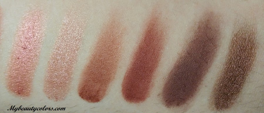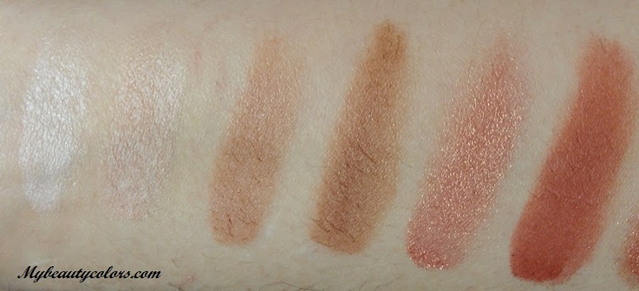 Los tonos cálidos son omnipresentes, eso sí, en mayor y menor intensidad. La paleta nos presenta 12 sombras. Ocho de ellas son de acabado mate y el resto son más bien metalizadas. Las sombras mate son un poco más secas pero su acabado también es ligeramente nacarado. Es un brillo muy sutil, pero se aprecia si las miramos bien. Me gusta porque les da un puntito luminoso y así quedan más bonitas. Las metalizadas, a parte de tener un brillo sumamente bonito y favorecedor, tienen una textura un poco más sedosa. Al pasar el dedo para hacer los swatches que os dejaré a continuación noté que las sombras soltaban un poco de polvillo, pero al maquillarme con ellas, no me dejaron nada de polvo en las mejillas, así que me quedé gratamente sorprendida. En cuanto a la pigmentación, no tengo ninguna queja, me parece estupenda, y para que podáis verlo con vuestros propios ojos, aquí os dejo las fotos con los 12 colores que podemos encontrar.