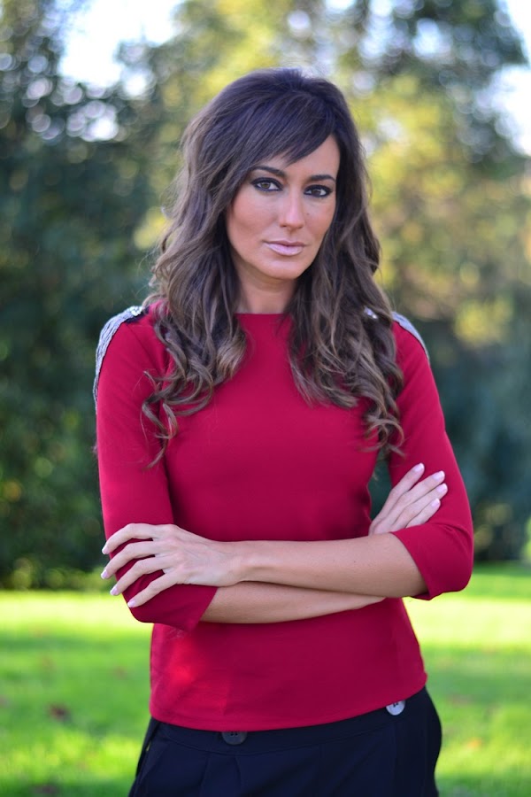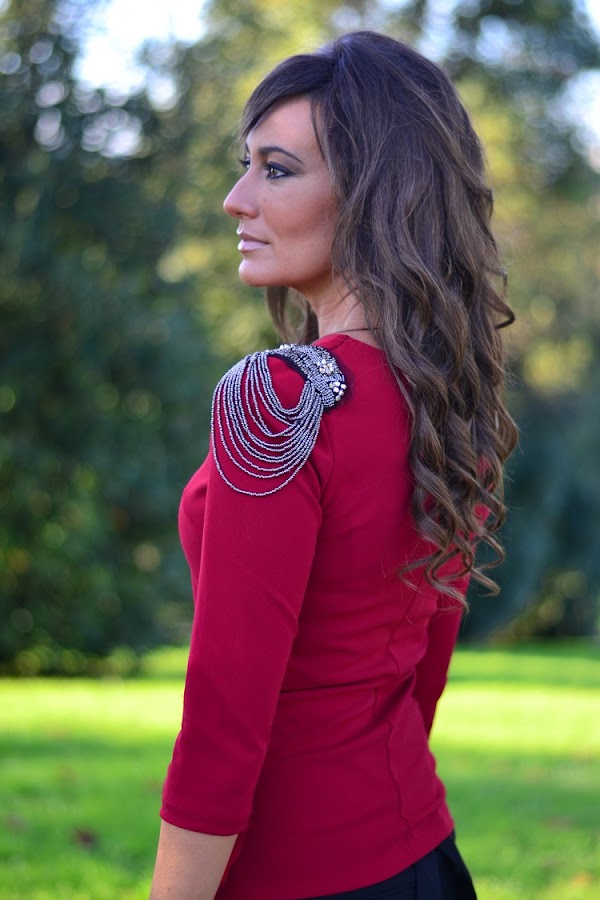 Concretamente, una blusa de manga tres cuartos, con cuello redondo y cremallera en la parte posterior, en un tejido con cuerpo que se adapta a la figura y la estiliza, con detalle de cadenas y abalorios metálicos en los hombros en color plata, que me pareció súper original.