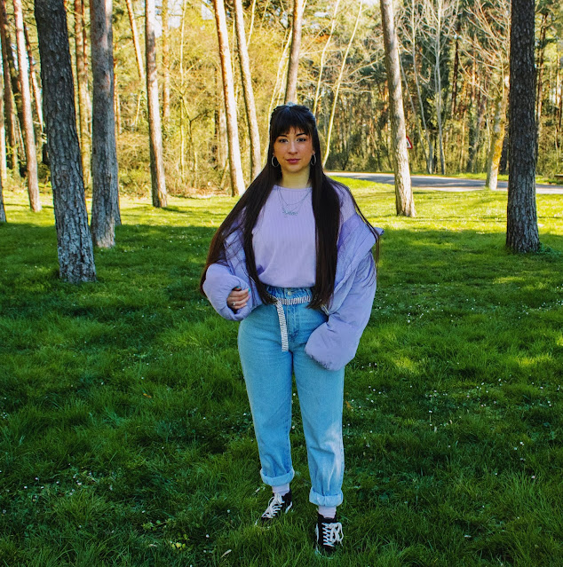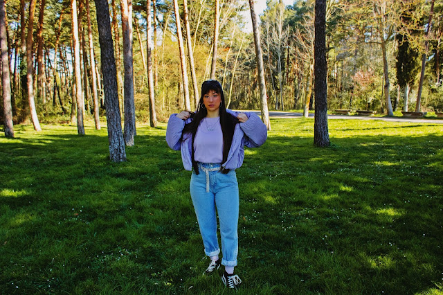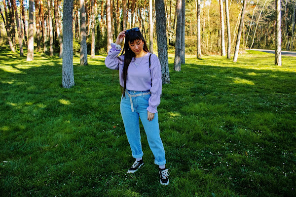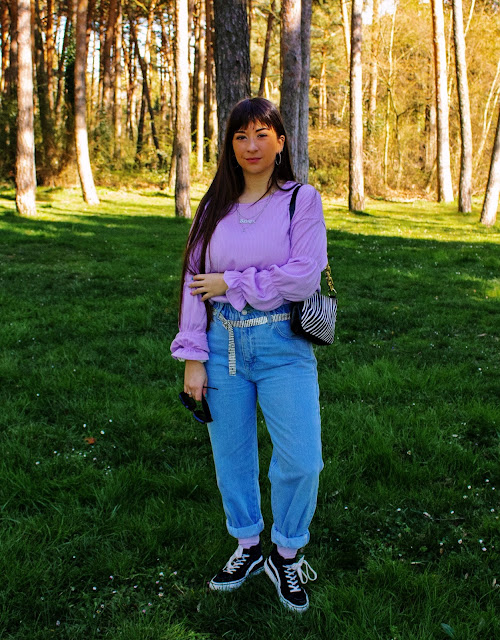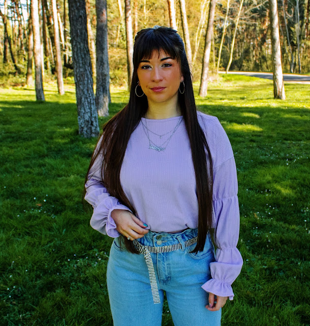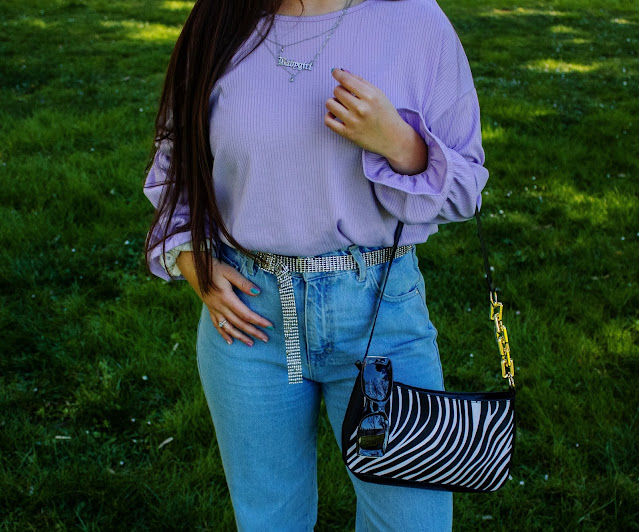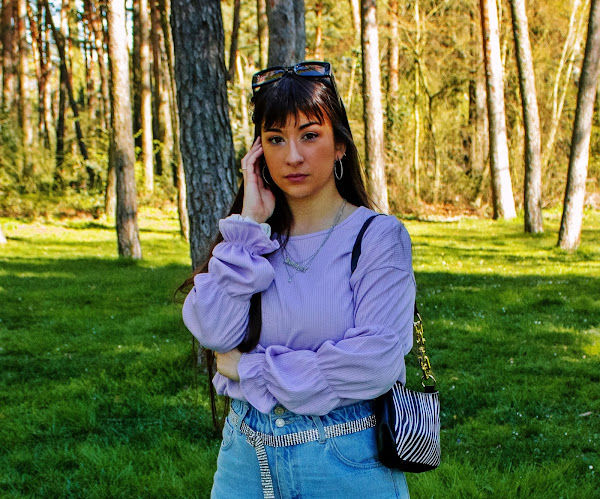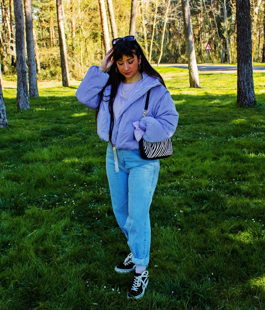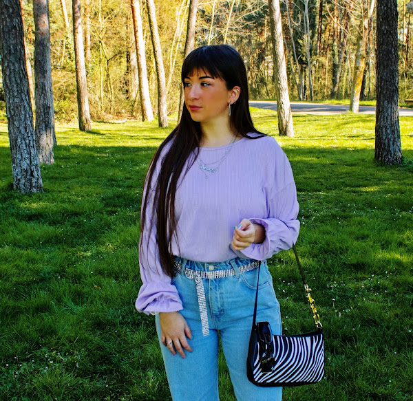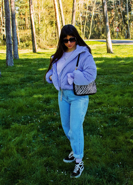 En el outfit de hoy os enseño un top lila de Dresslily (Link) que me encanta y dos accesorios: Un bolso estilo baguette con estampado de cebra y unas gafas negras con detalles dorados. Ambos complementos son también de Dresslily y destaco su gran calidad y originalidad. El resto lo combino con chaqueta y calcetines del color estrella de hoy, vaqueros y sneakers.