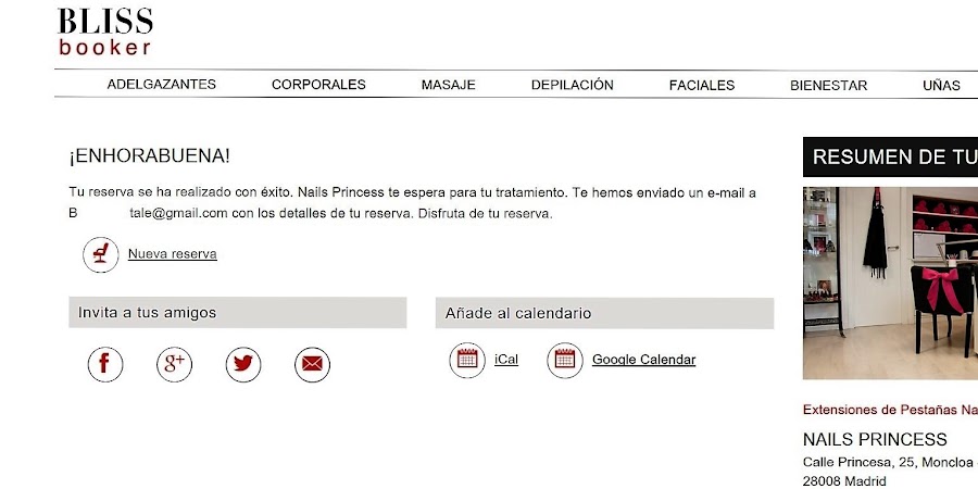 Blissbooker significa algo así como "reservador" de felicidad y es que esta pagina web tan novedosa tiene gran éxito, ya que podemos reservar sin preocuparnos si el centro esta abierto, sin necesidad de llamar por teléfono, pudiendo elegir y saber los precios, servicios... Y algo muy positivo es que podemos cancelar hasta 24h antes sin que se lleve a cabo ningún coste.