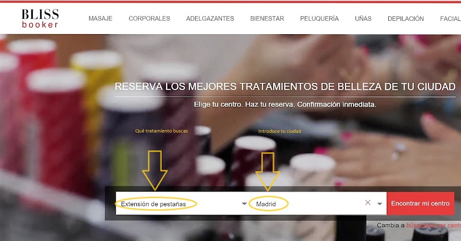 Me llamaba la atención este nuevo boom de extensiones de pestañas, no lo dude e hice mi reserva, ademas de una manicura. Como??. Muy fácil!!. En la pagina inicial, tienes varias pestañas en las que puedes buscar que tratamiento estas buscando y la ciudad. En mi caso, elegí extensiones de pestañas en Madrid.
