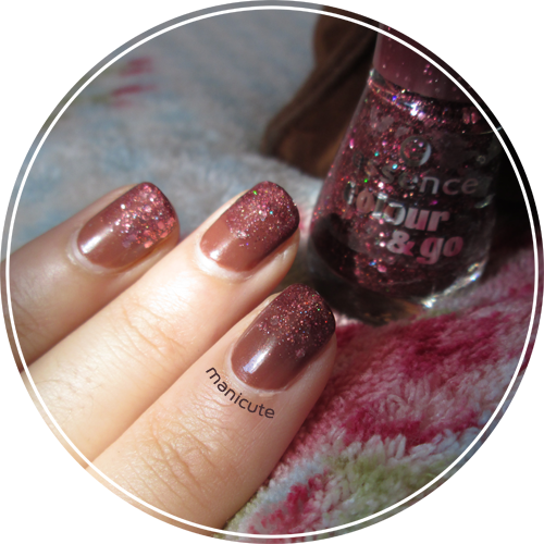 ¡Continuamos con la manicura! Una vez tuve bien seca la base marrón, pinté directamente con el esmalte de glitter cobrizo de essence sobre una esponjita de maquillaje, y de ahí apliqué en la uña una primera capa. Gracias a esta técnica, que conozco por Nailwish (podéis ver el tutorial aquí) se puede aplicar cualquier esmalte de purpurina sin que tarde mil siglos en secar. En mi caso, apliqué una segunda capa de glitter sólo en las puntas para crear el efecto degradado, y gracias a la esponja no me quedó abombada la manicura. Una gozada.