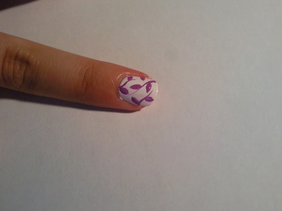 Si hasta este momento has cometido algún fallo, no te preocupes, puedes taparlo en el siguiente paso. Usamos un esmalte morado más oscuro y hacemos unas flores sencillas. Entonces el resultado final será este: