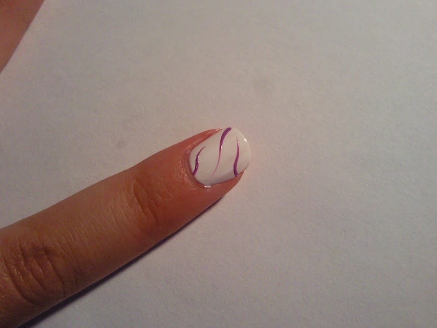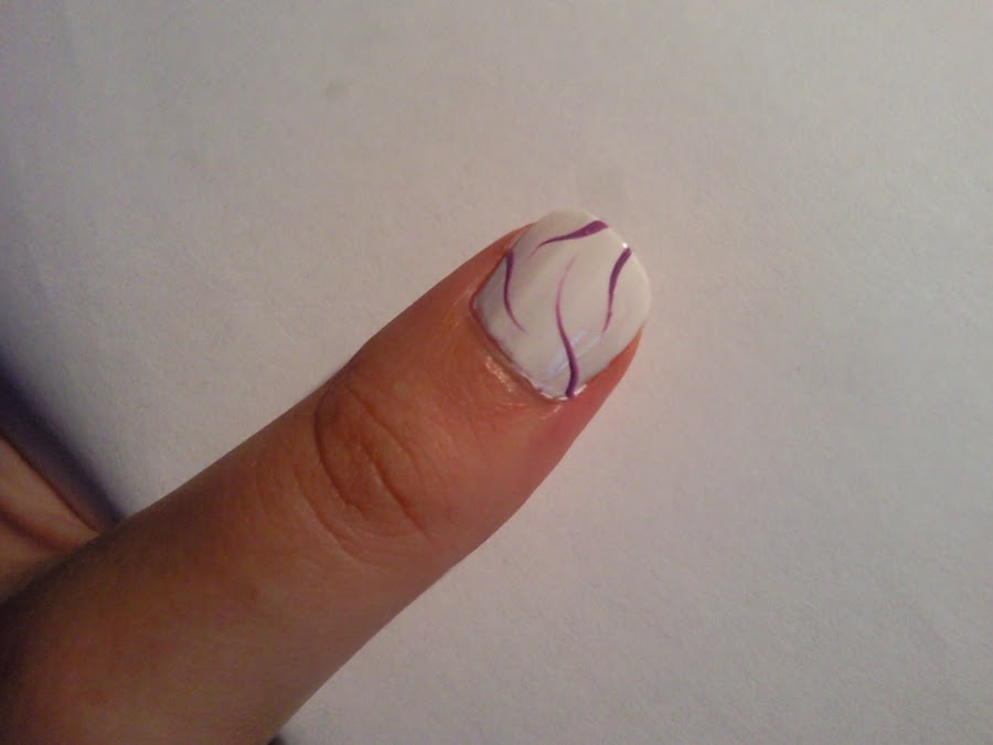 Una vez hecho esto, usamos el pincel para líneas y el esmalte morado, y hacemos unas cuantas por la uña, en distintas direcciones y con un poco de curva.