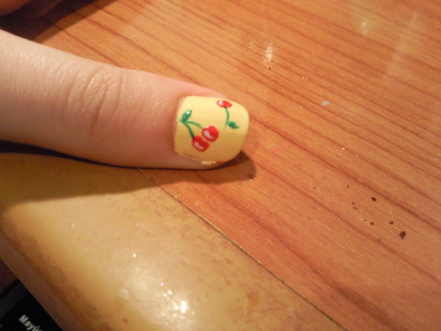 Now, we"re going to do the cherries, step by step. Frist, make the stem with the thin brush and green polish. You can three stems, two o just one.