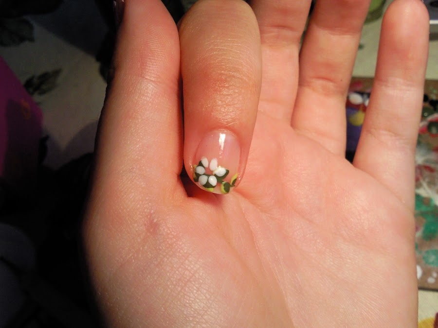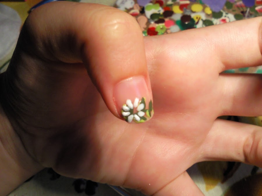 Seguidamente, con esmalte verde claro, hago un fondo de hojas sobre la línea. Esto hará que las hojas tengan más vistosidad, pero no es necesario que sean perfectas.