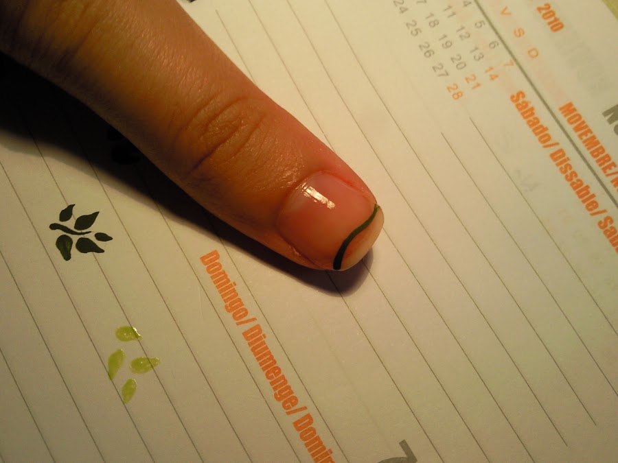 Empiezo haciendo una línea curva en la punta de cada uña, y en el dedo anular añado otra hacia arriba.