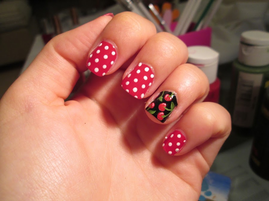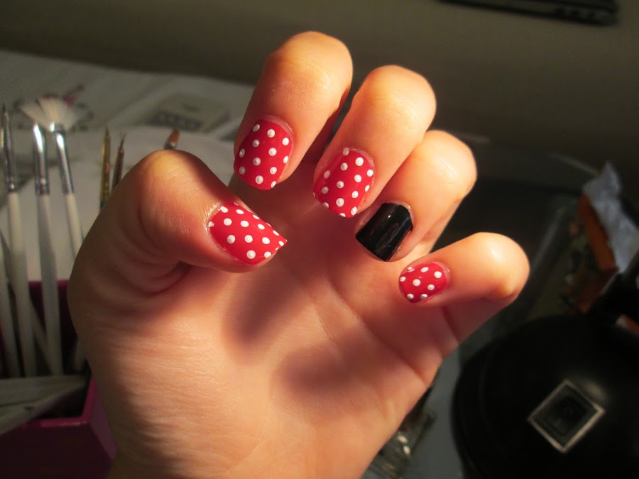 En las uñas rojo, el diseño es muy sencillo, una simple trama de lunares blancos.