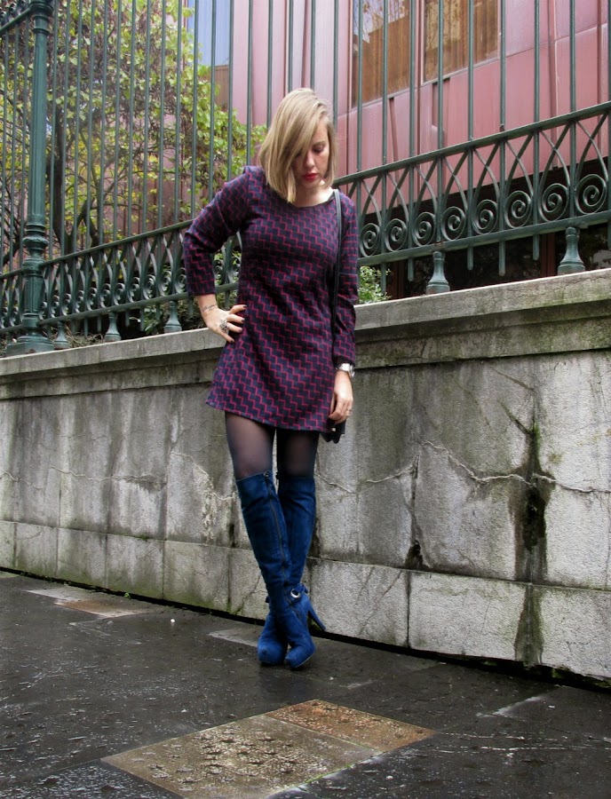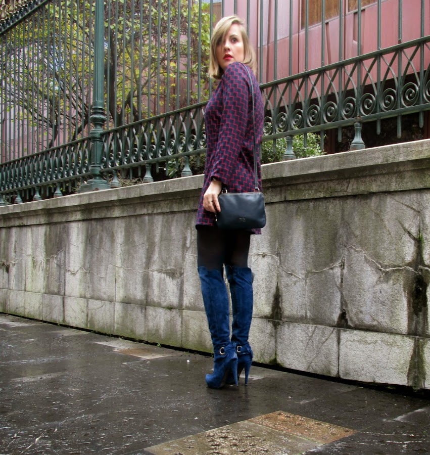Un mini vestido con aires retro no necesita mucho mas para conformar un bonito look. Siguiendo la línea de aires sesenteros lo combiné con unas botas altas y un abrigo amplio.