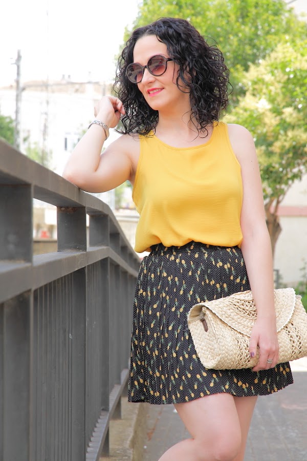 A principio de la temporada hice un post hablando del estampado de piñas, en él os conté que lo íbamos a ver muchísimo ya que iba a ser una de las tendencias de este verano. Pues bien hasta ahora no os había enseñado ninguno de mis looks con ellas. Esta falda fue un regalo de mi madre y la verdad que me encantó, el estampado de piñas y los topitos en blanco quedan muy finos y no se ve un print recargado como otras prendas que he visto. Combinada con blanco queda genial pero hoy me apetecía darle más vida al estampado, así que me he decantado por un top en el mismo color para hacerlas resaltar. En los pies mis nuevas cuñas, estoy encantada con ellas porque son muy cómodas, algo que siempre intento buscar.